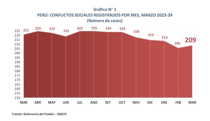 La Defensoría del Pueblo presentó el Reporte de Conflictos Sociales N° 241, correspondiente al mes de marzo de 2024, en dónde registra un leve incremento de casos, que pasaron de 206, en febrero, a 209, en marzo.