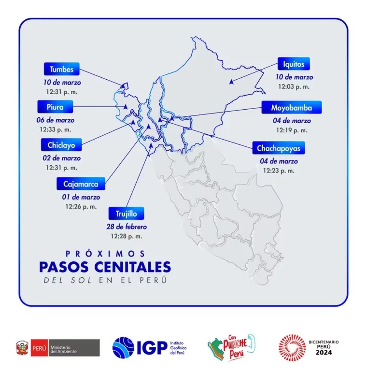 Desde el miércoles 28 de febrero, las regiones del norte y nororiente de Perú están experimentando el Paso Cenital del Sol, un fenómeno en el cual el sol se encuentra directamente sobre nuestras cabezas, lo que resulta en la ausencia de sombras en los objetos verticales durante unos minutos.