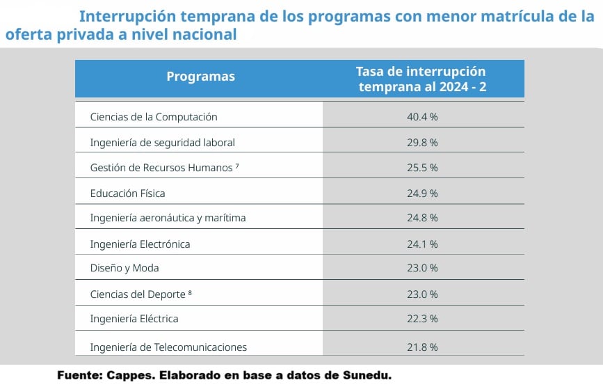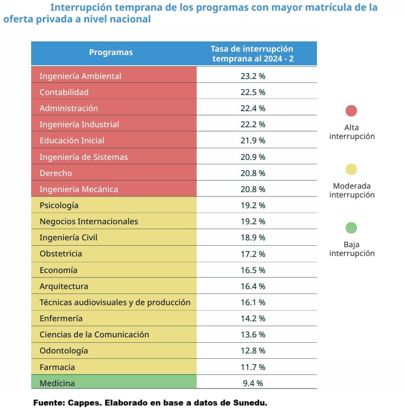 A nivel de las carreras con alta demanda de matriculados (con más de 5,000 estudiantes por carrera que iniciaron sus estudios desde 2022), las profesiones con mayor nivel de interrupción fueron ingeniería ambiental, contabilidad, administración e ingeniería industrial, con una tasa de interrupción por encima del 22% (ver cuadro).