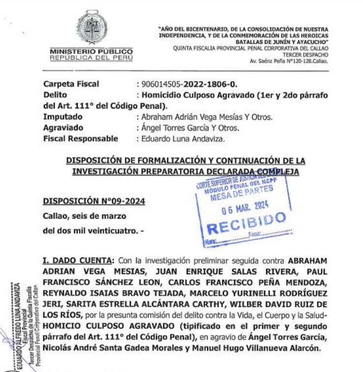 “A través de la disposición N. ° 09, el Ministerio Público comunicó al Poder Judicial que estas personas son investigadas por el delito de homicidio culposo agravado, en perjuicio de tres bomberos aeronáuticos”, señaló a través de sus redes sociales.