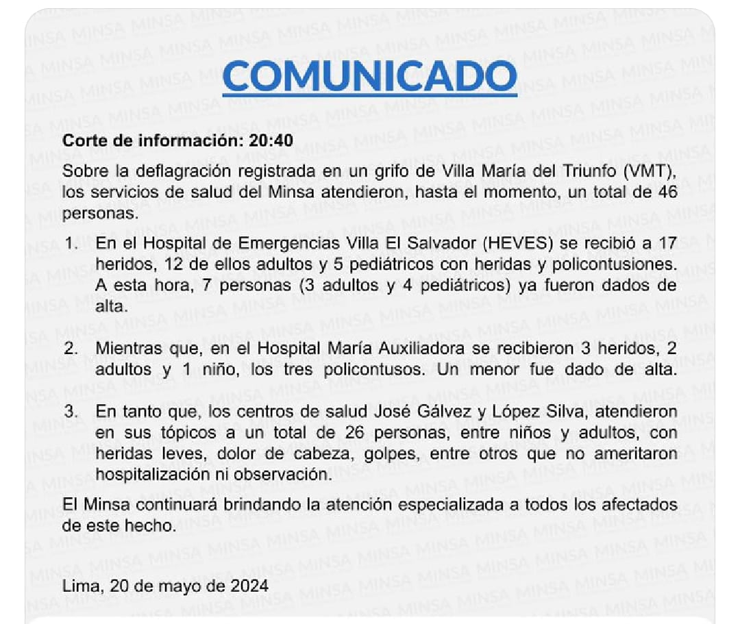 El ministro del Interior, Juan José Santiváñez, indicó que actualmente la cifra de heridos es de 40 personas y que la emergencia en la zona continúa, por lo que se está priorizando la atención a las familias cuyas viviendas están cerca del grifo.