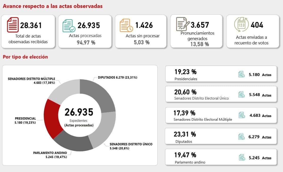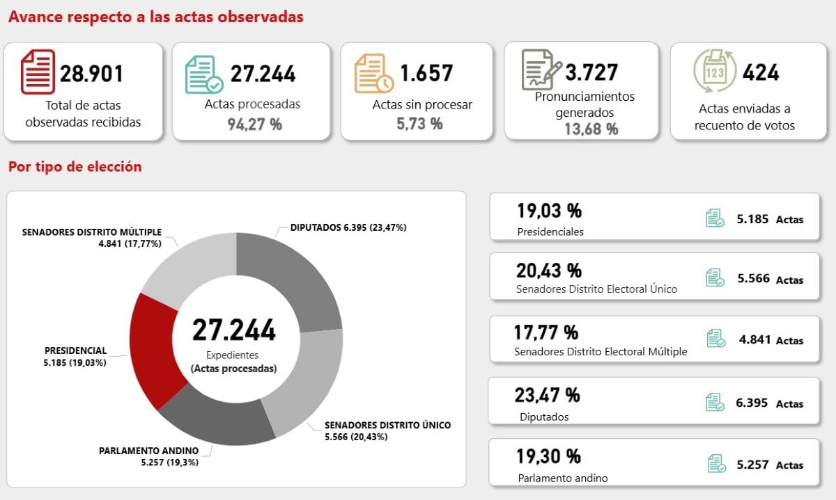 Además, el organismo electoral ha habilitado un tablero interactivo que permite a la ciudadanía seguir el avance en el procesamiento de actas observadas, así como el estado de los expedientes y los casos que pasan a recuento, facilitando un monitoreo continuo del desarrollo electoral.