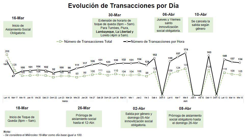 El siguiente cuadro muestra cómo hay más concentración de compradores en los supermercados, medido por el número de transacciones por hora, en los días previos y posteriores a las fechas con inmovilización obligatoria, como las de Semana Santa.