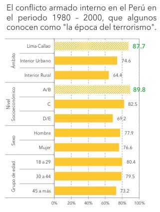 Por su parte, la enseñanza del conflicto armado interno en las escuelas alcanza el 87.7% en Lima y Callao. Sin embargo, en la zona urbana del interior del país la aprobación a este tema es de 74.6%, mientras que en la zona rural es de 64.4%.