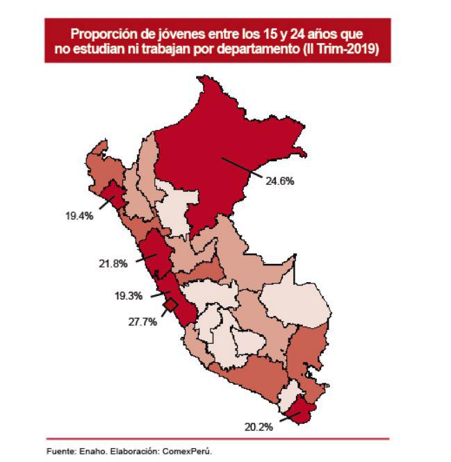 La región con mayor proporción de 'ninis’ en Perú es el Callao, con un 27.7% de jóvenes entre los 15 y 24 que ni estudian ni trabajan, es decir, 9.7 puntos porcentuales más que el promedio nacional, alertó Comex.