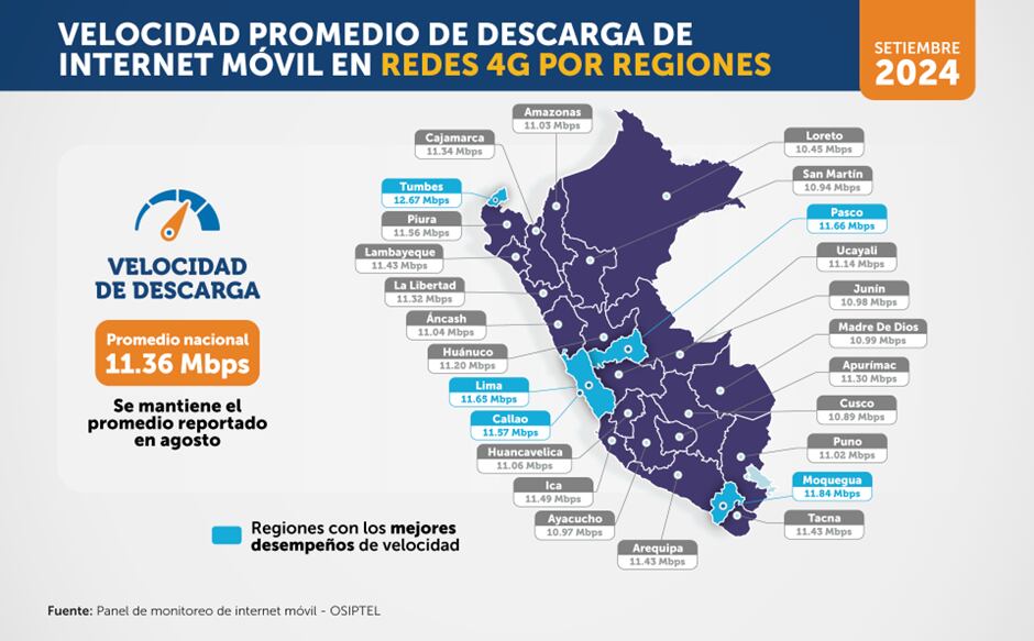El Organismo Supervisor de Inversión Pública en Telecomunicaciones (Osiptel) indicó que, en setiembre, la velocidad promedio de descarga del internet en redes móviles con tecnología 4G fue de 11.36 Mbps (megabits por segundo) a nivel nacional, manteniendo el promedio reportado en agosto, de acuerdo a la información publicada en la herramienta Checa tu internet móvil.