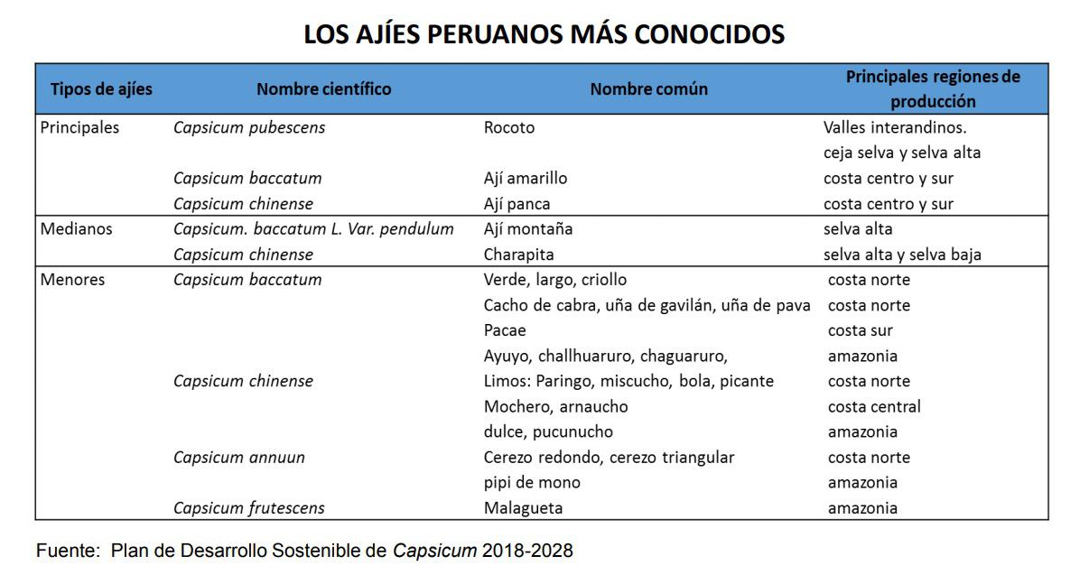 Nuestro país cuenta con más de 350 variedades de ajíes, rocotos y pimientos registradas, cultivadas en los 24 departamentos del país, siendo los más, el ají amarillo, el ají panca, el ají charapita, el ají montaña, el rocoto, el ají limo, entre otros, así como otros que, sólo son conocidos localmente como el cacho de cabra, pipí de mono, pacae, cerezo, etc.