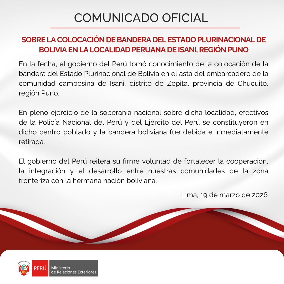 El ministerio de Relaciones Exteriores indicó que en la fecha el gobierno del Perú tomó conocimiento de la colocación de la bandera del Estado Plurinacional de Bolivia en el asta del embarcadero de la comunidad campesina de Isani, distrito de Zepita, provincia de Chucuito, región Puno.