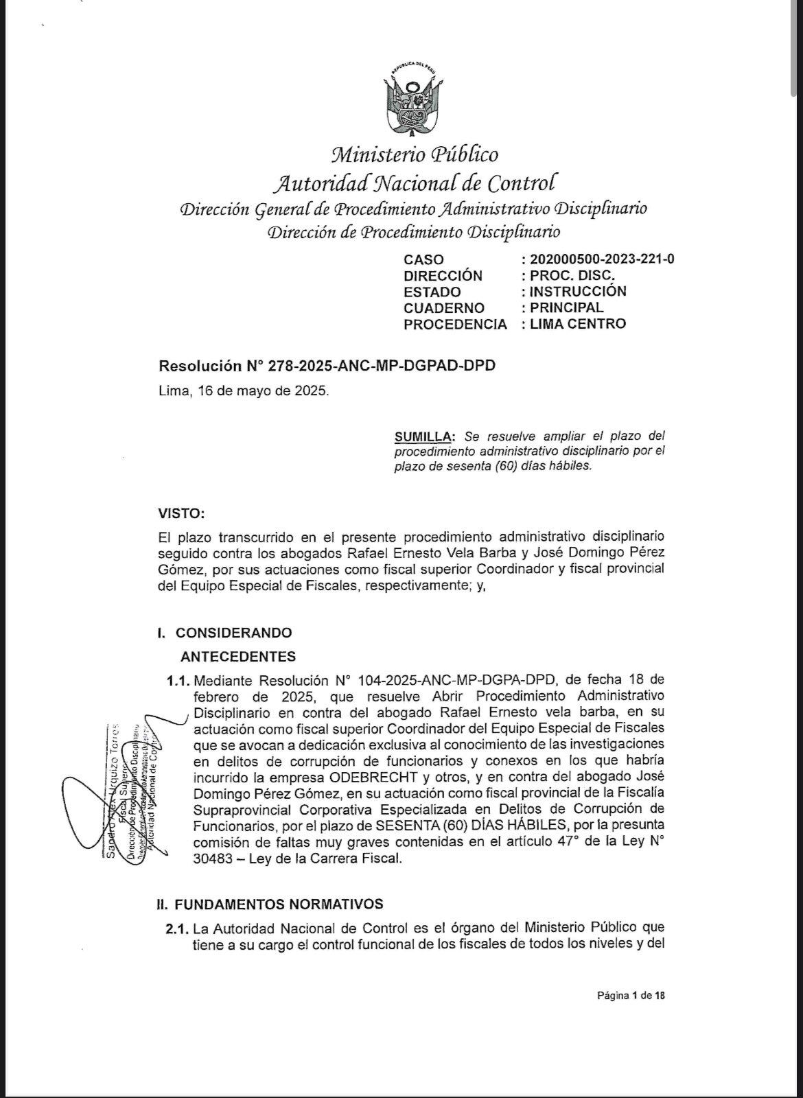 La Autoridad Nacional de Control del Ministerio Público (ANC), encabezada por Juan Antonio Fernández Jerí, resolvió ampliar por 60 días hábiles el plazo del procedimiento administrativo disciplinario que se sigue contra los fiscales superiores Rafael Vela Barba y José Domingo Pérez Gómez, integrantes del Equipo Especial Lava Jato.