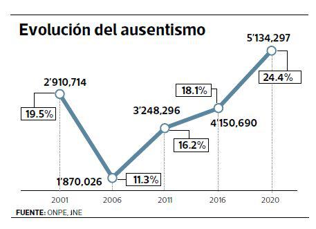 El ausentismo en las elecciones aumentó por tercera elección congresal consecutiva. Sin embargo, la cifra de no votantes en el proceso del domingo alcanzó un récord histórico de 5.1 millones de peruanos que no asistieron. Se trata del 24.49% del total de electores que figuraban en el padrón.