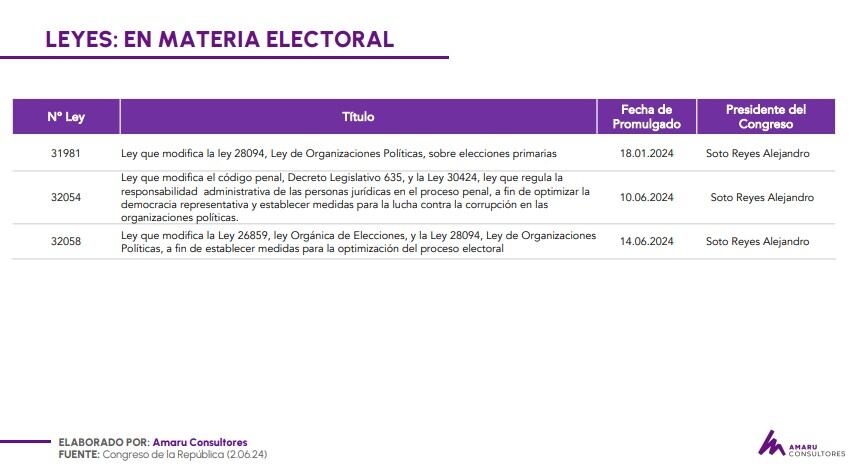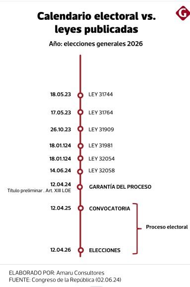 Ahora para las elecciones generales del 2026 ya se han emitido hasta ahora seis nuevas normas, ello sin contar el cambio constitucional que permite el retorno de la bicameralidad, según refleja el último informe de Amaru Consultores. (Ver gráfico).