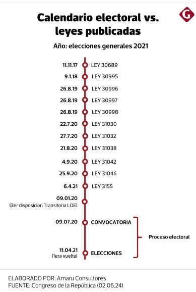 En los últimos años, se han registrado constantes cambios a las reglas electorales. Si se observa el 2021 en las elecciones generales que llevaron a Pedro Castillo a la presidencia, se emitieron desde el años 2017 un total de 11 nuevas leyes. (Ver Gráfico)