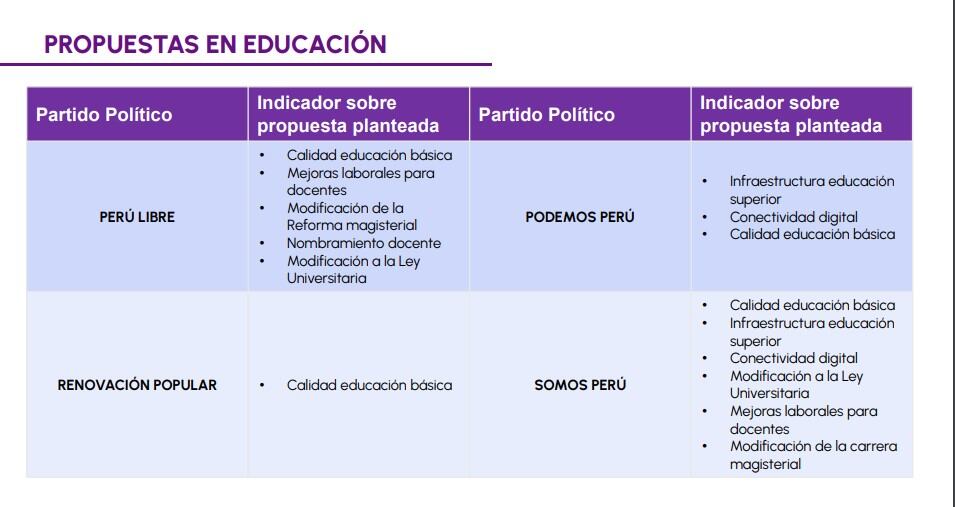 Para ello, separaron los proyectos de ley del sector de educación básica y de la educación superior para compararla con las propuestas de campaña de los partidos políticos.
