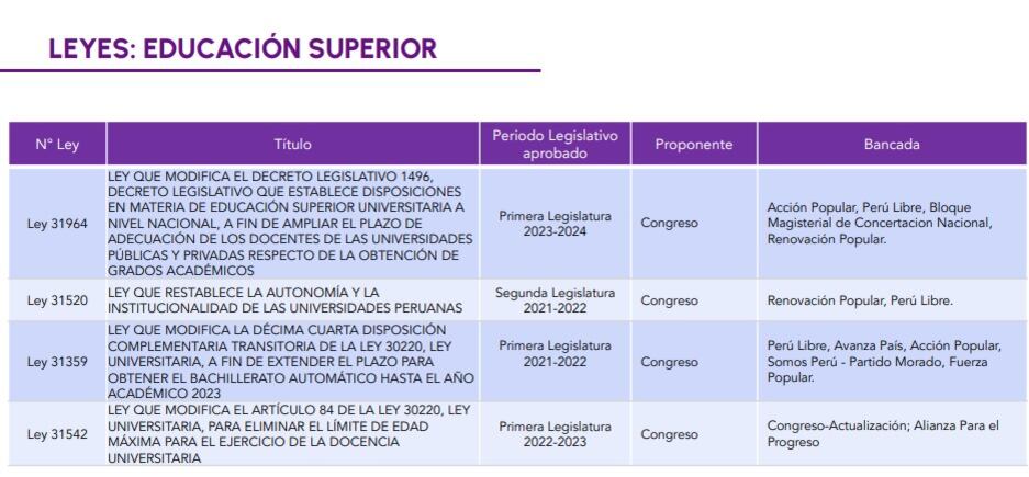 Con relación a algunas leyes que fueron cuestionadas es interesante analizar cuales fueron sus proponentes y si responden a algunas promesas de campaña. Por ejemplo, sobre la ley 31542, sus proponentes Perú Libre y Renovación Popular no mencionaron modificación a la Ley Universitaria. Lo que nos hace suponer que mucho proyectos de ley surgen durante el camino, a raíz de exposiciones de algunos de los actores involucrados.