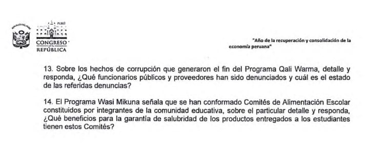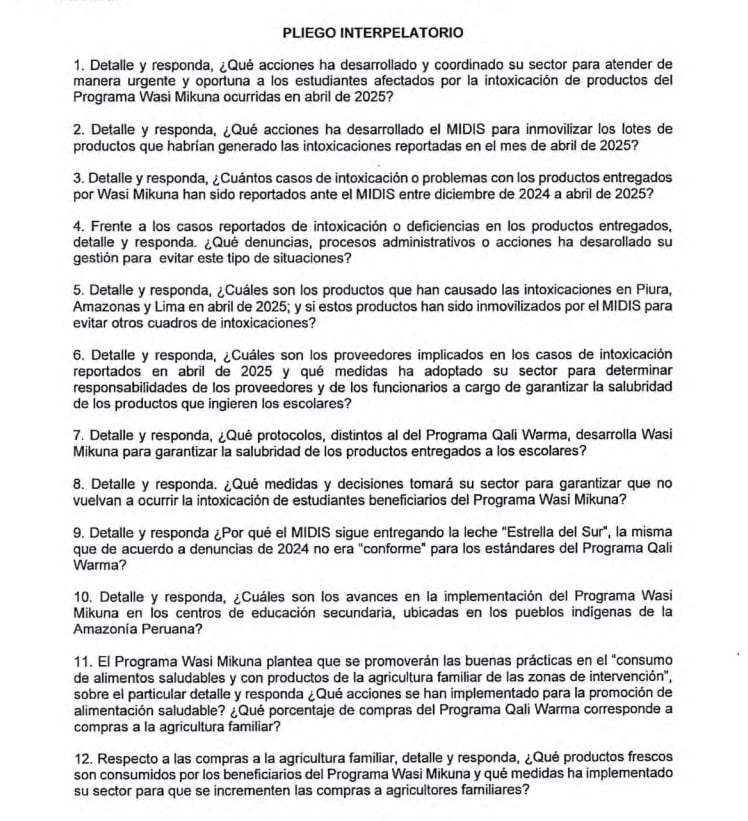 “Estos no serían los únicos incidentes, ya que con fecha 01 de abril de 2025 se reportó la intoxicación de estudiantes en el Distrito de Los Olivos en Lima, inclusive sobre el caso, la Directora de Wasi Mikuna, Nancy Villavicencio reportó que no se volvería a contratar a los proveedores involucrados en el referido hecho de intoxicación”, se indica en el documento que contiene 14 preguntas.