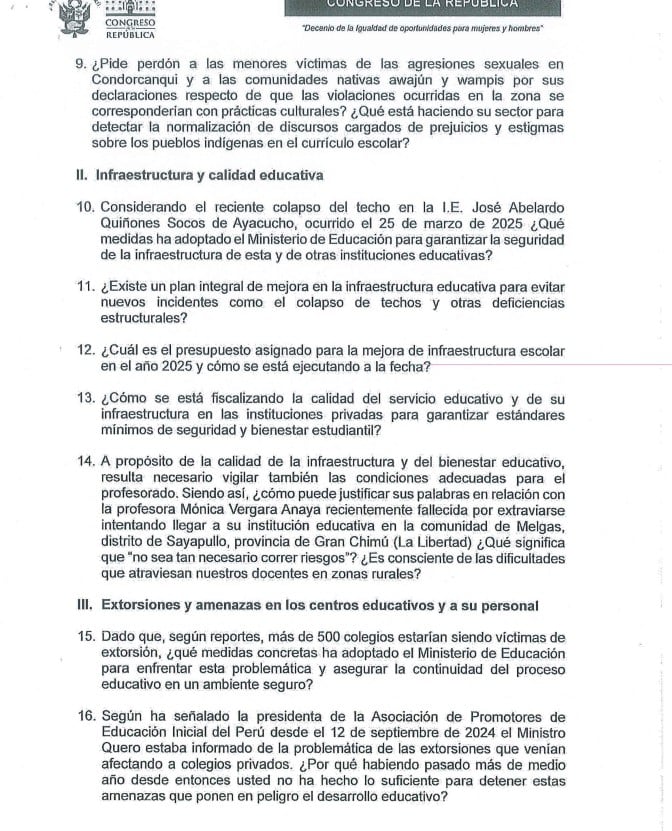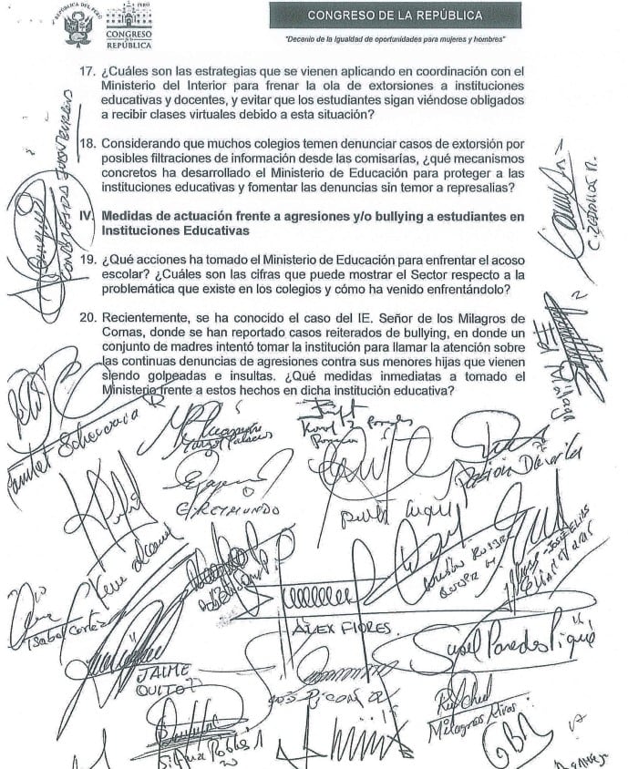 “Luego de algunas semanas de iniciado el año escolar, el ministro de Educación ha mostrado una falta de liderazgo y coordinación efectiva para detener la creciente ola de extorsiones a instituciones educativas en Lima, lo que ha generado un grave clima de inseguridad en la comunidad educativa. Así, muchos estudiantes se han visto obligados a recibir clases virtuales, afectando su proceso de aprendizaje e incluso, se han reportado casos de extorsión a docentes, lo que agrava aún más la situación en el sector educativo”, refiere el documento.