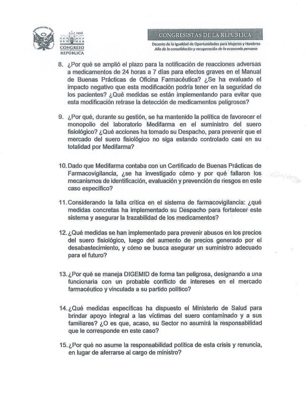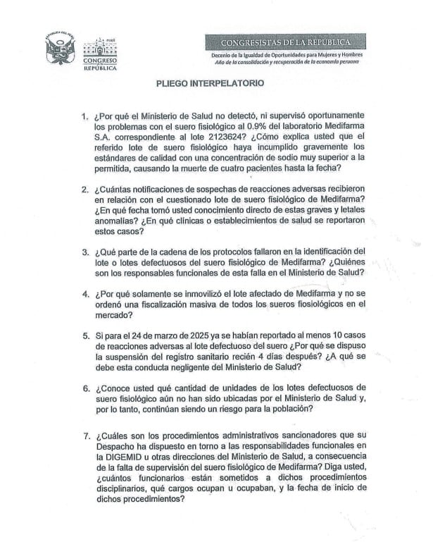 En el documento, que cuenta con 15 preguntas, entre los considerandos se cuestiona la reacción del Ministerio de Salud tras registrarse las muertes por el suero defectuoso.