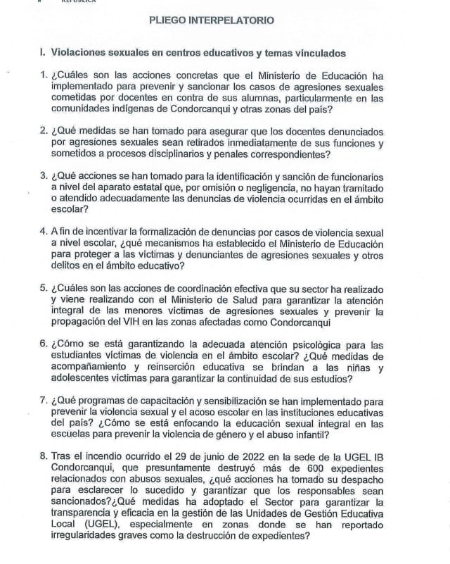 Reymundo sostuvo que el pliego interpelatorio “ha sido pensado solamente para invitar al ministro”. “No debe tener miedo en venir porque lo que buscamos es interpelar y poner los puntos sobre la mesa para que el ministro venga al Congreso y pueda responder”, señaló en RPP.