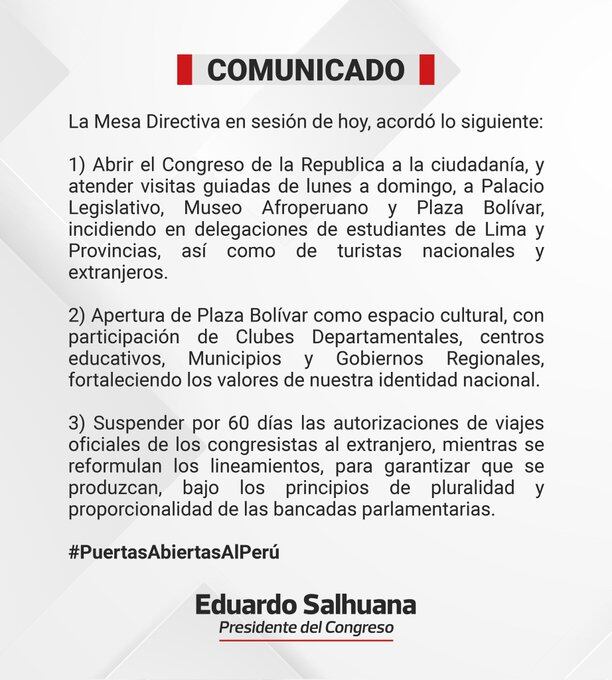 “Suspenden por 60 días las autorizaciones de viajes oficiales de los congresistas al extranjero, mientras se reformulan los lineamientos para garantizar que se produzcan, bajo los principios de pluralidad y proporcionalidad de las bancadas parlamentarias”, informó a través de un comunicado.
