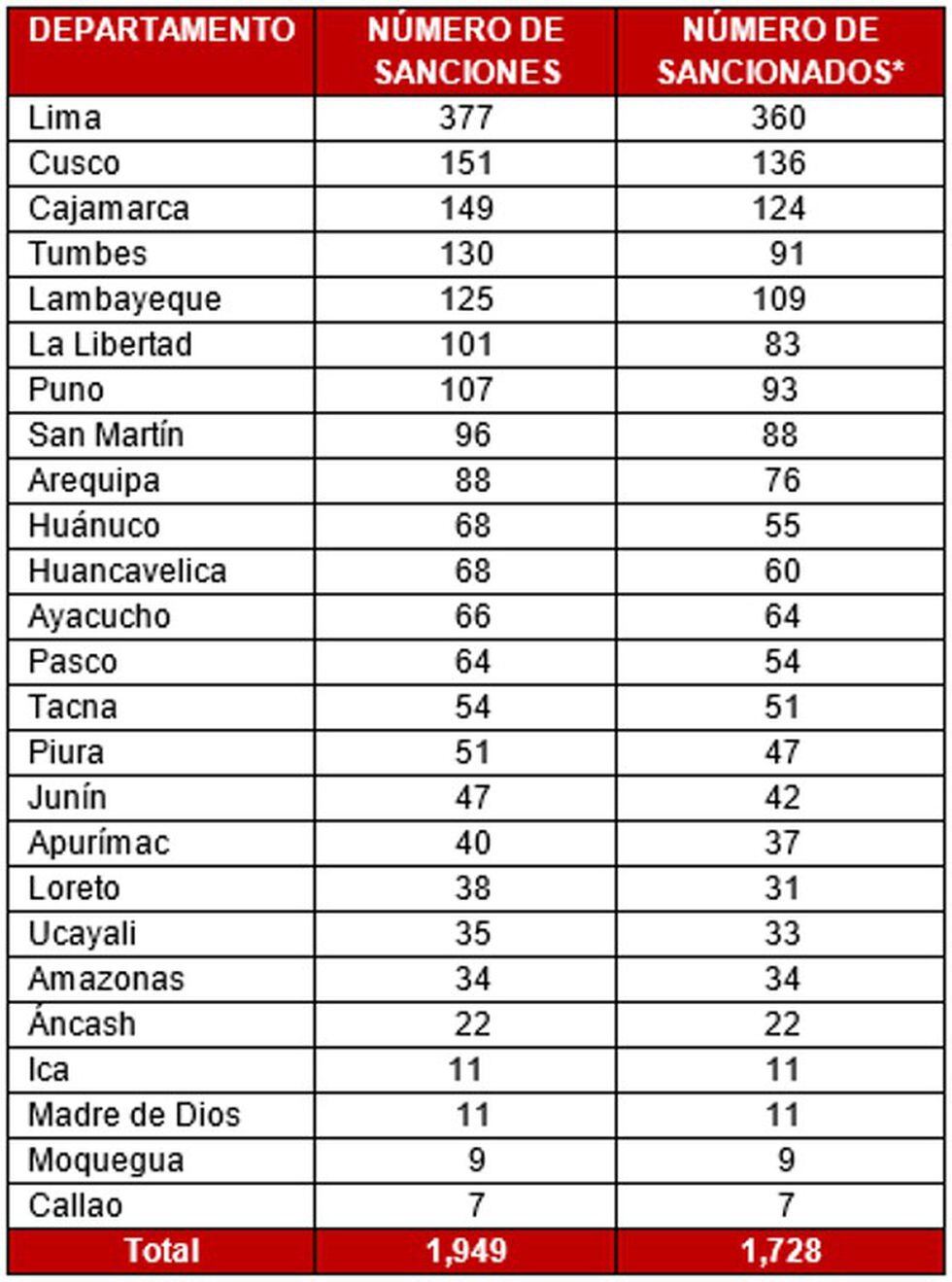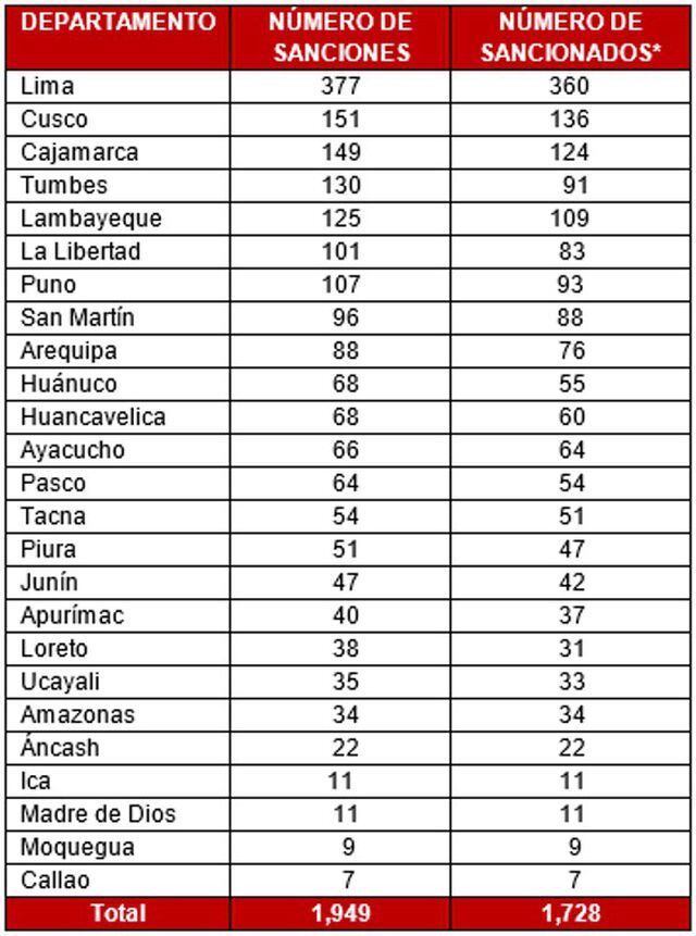 Mientras que los departamentos con menor número de sancionados fueron: Callao (7), Moquegua (9), Madre de Dios (11), Ica (11) y Áncash (22).