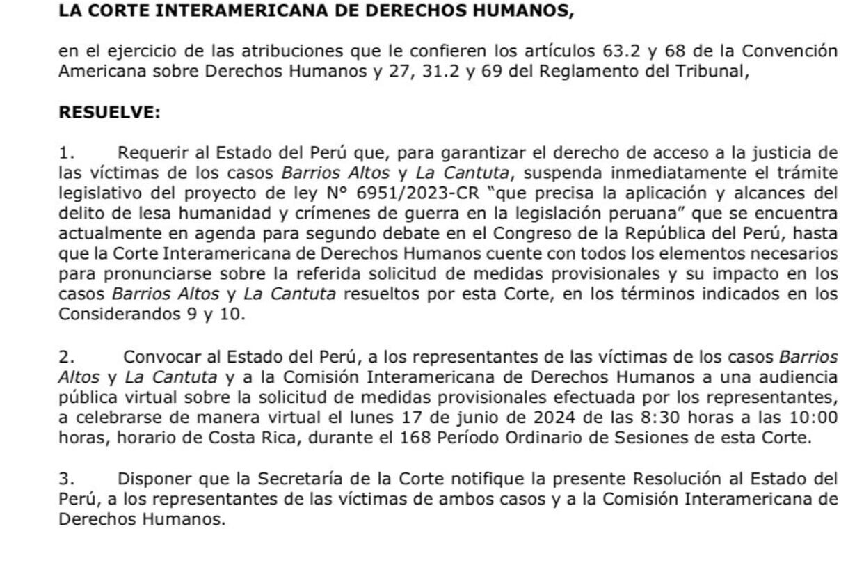 Asimismo, se procedió a convocar al Estado peruano, así como a los representantes de los deudos de Barrios Altos y La Cantuta y a la Comisión Interamericana de Derechos Humanos (CIDH) a una audiencia pública virtual para el lunes 17 de junio del 2024 las 8:30 a.m. hora de Costa Rica.