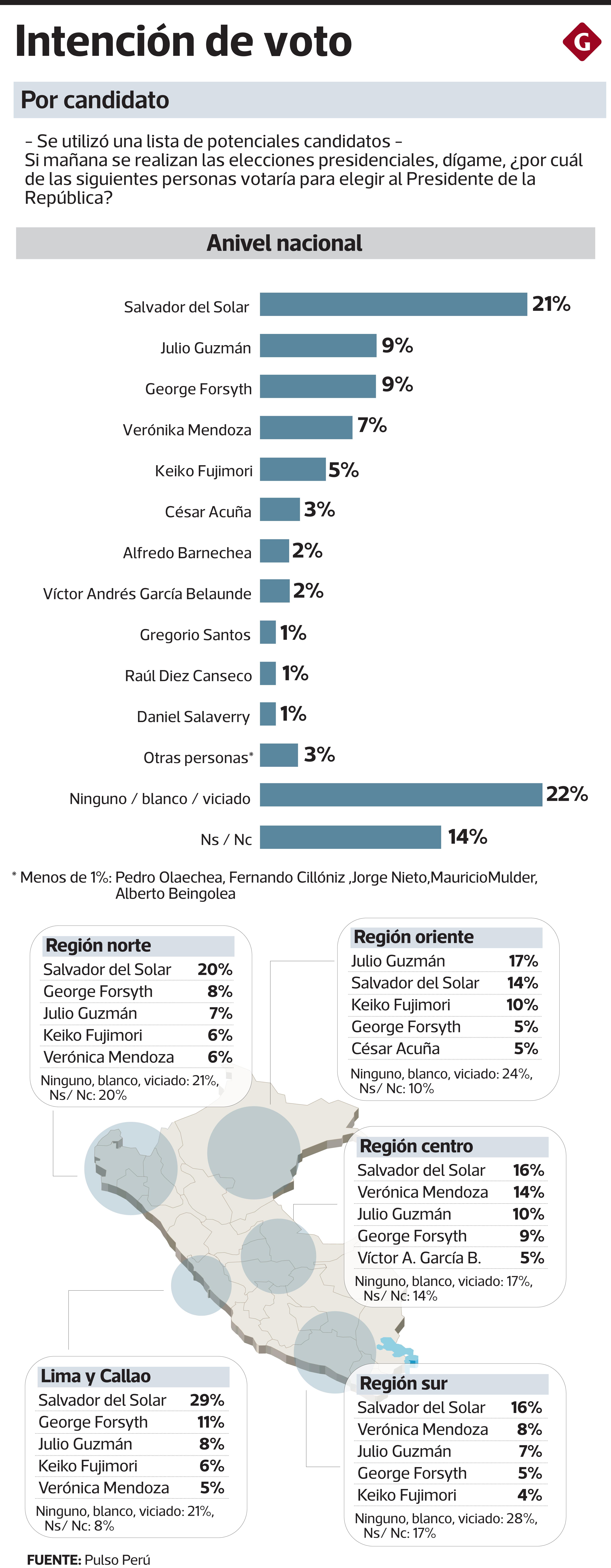 Del Solar lidera en cuatro de las cinco regiones (Lima, sur, centro y norte), únicamente no encabeza la intención de voto en el oriente.