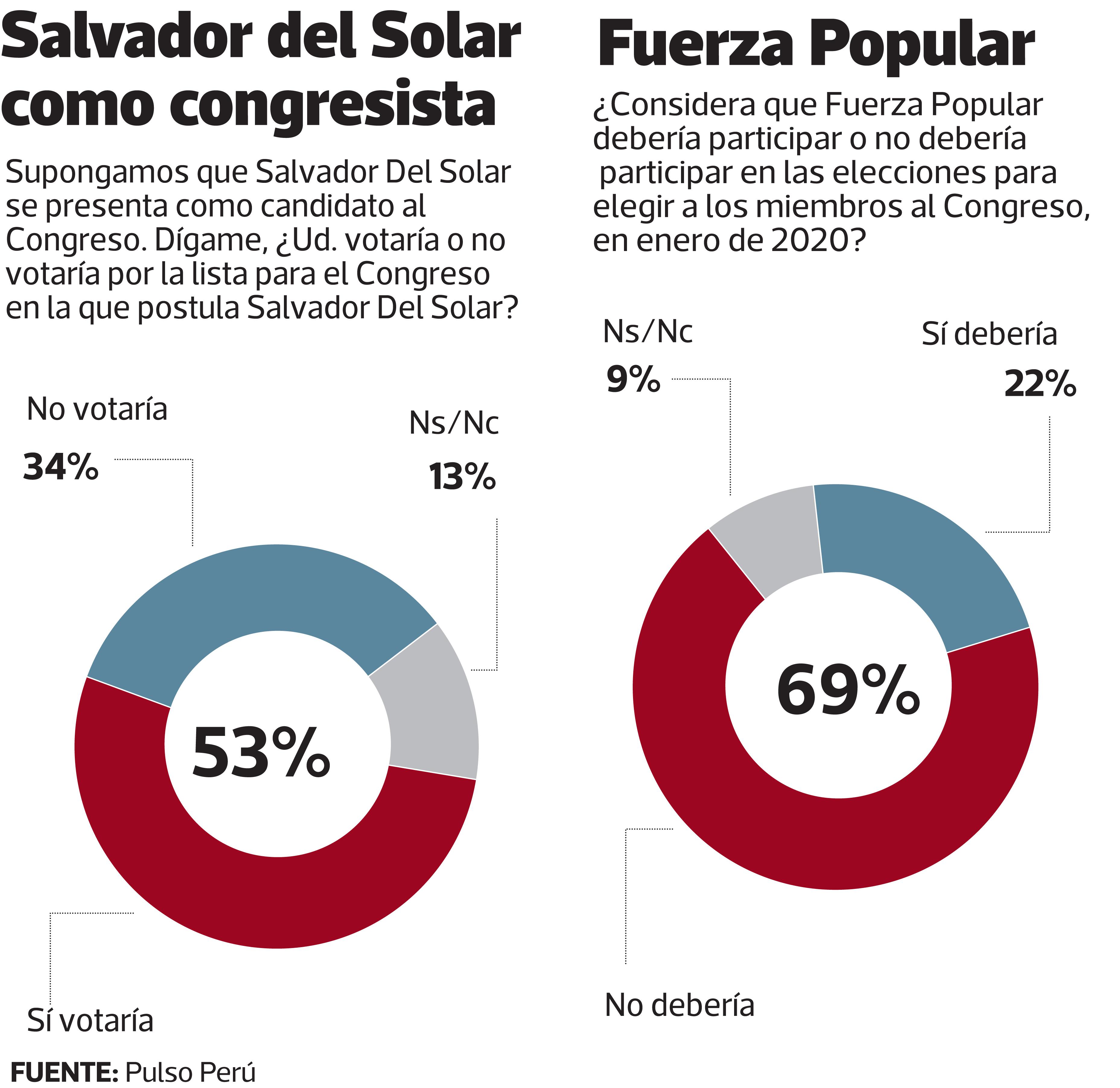 El 53% se muestra dispuesto a votar por una lista congresal que lidere Salvador del Solar, quien sin embargo no ha manifestado su interés por postular. El mayor respaldo a una eventual candidatura parlamentaria del exjefe del Gabinete está en el sector A/B, con 70.1%, y en Lima, con 62.4%. ¿Y el rechazo? Hay un 34% que no votaría por Del Solar, porcentaje que alcanza al 42.1% en el sector E y al 41.4% en el oriente.
