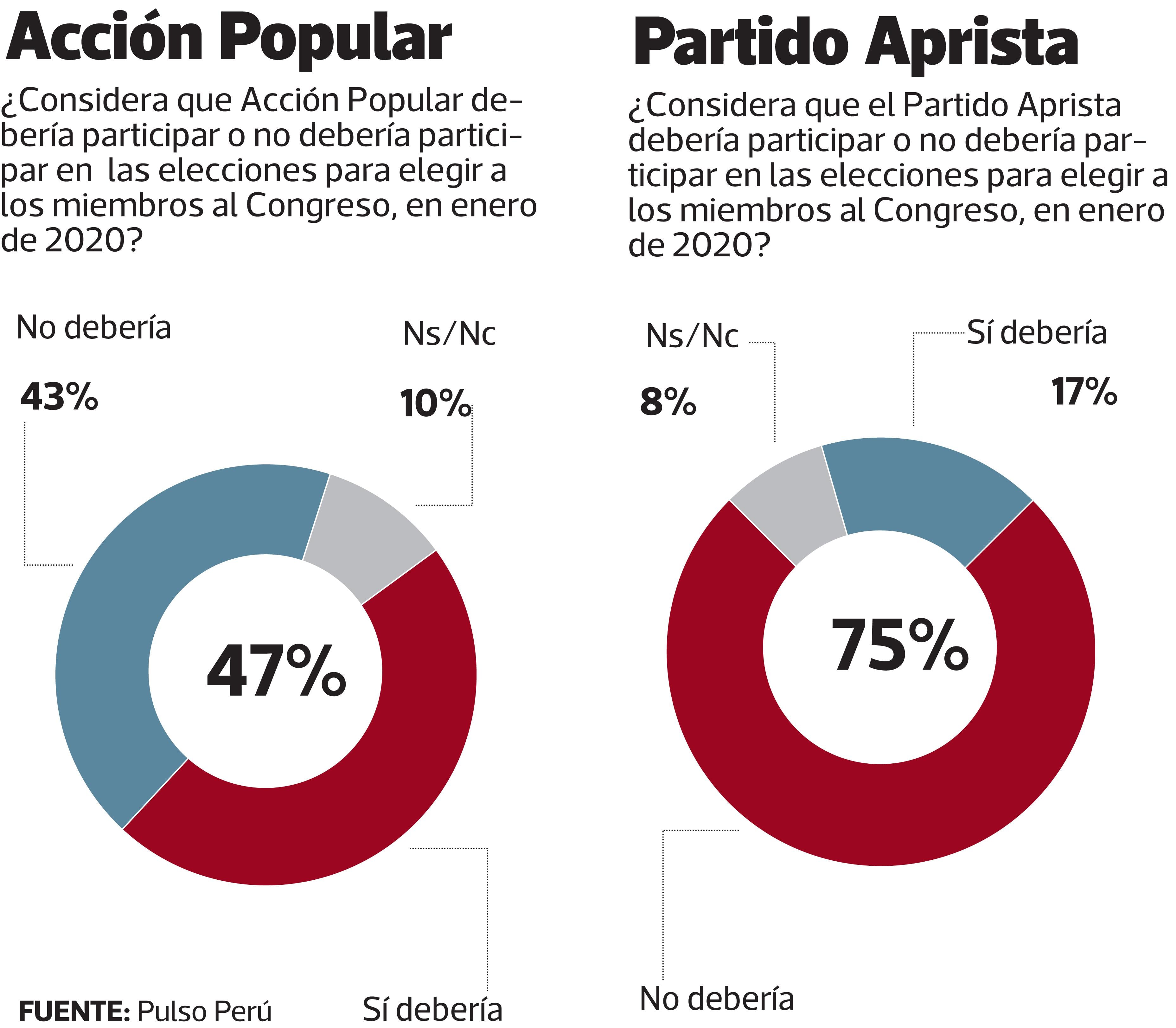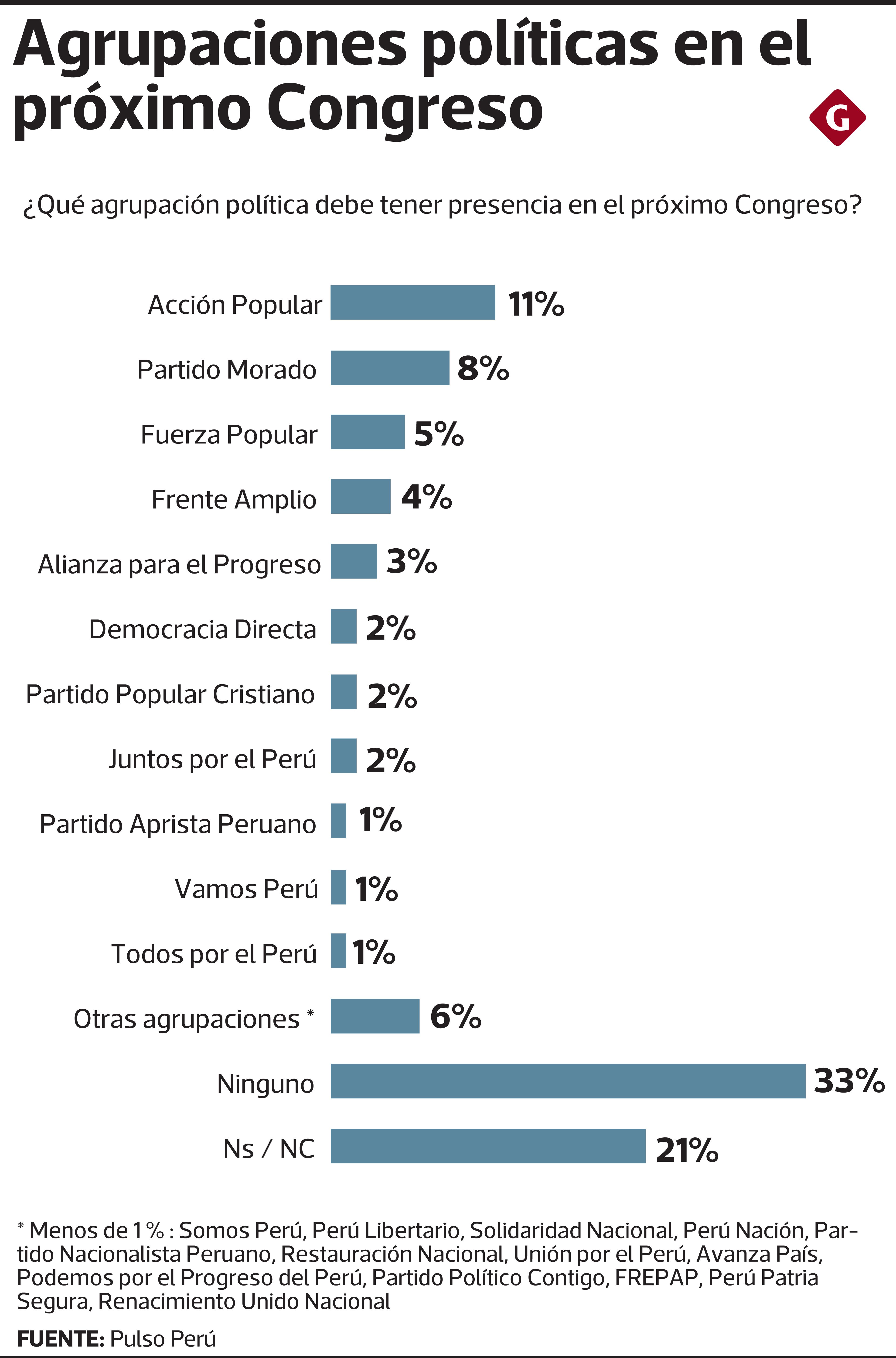 ¿Y qué agrupaciones deberían de tener presencia el próximo año? Las preferencias las lidera Acción Popular, con 11%. El mayor apoyo a que el partido de la lampa tenga presencia en el Parlamento proviene del segmento A/B, con 19.8%, y de Lima, con 13.7%.