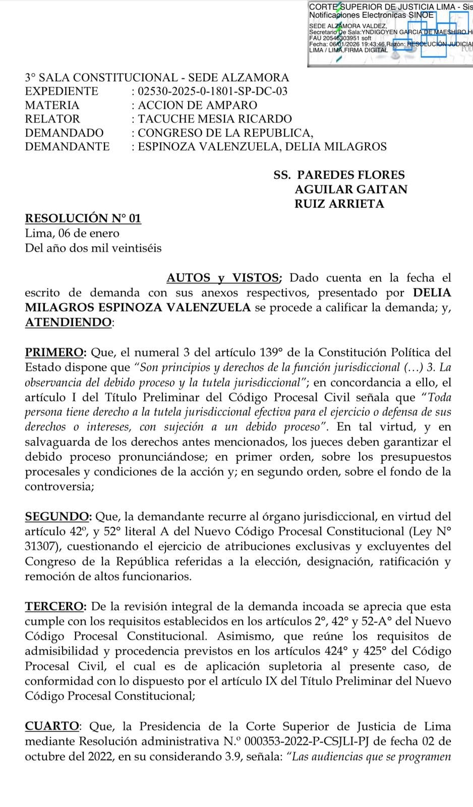 Según la Resolución N.° 01, emitida el 6 de enero de 2026, el colegiado consideró que la demanda cumple con los requisitos de admisibilidad y procedencia previstos en el Nuevo Código Procesal Constitucional, por lo que corresponde su tramitación.