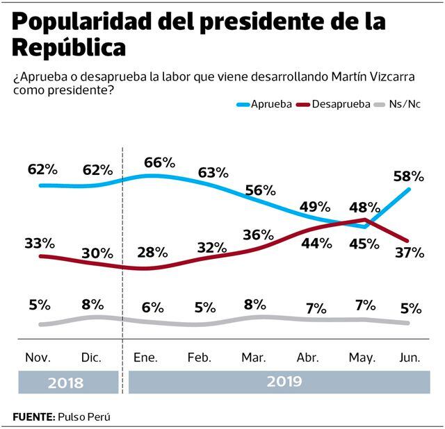 El presidente Martín Vizcarra había visto como su popularidad no paraba de caer desde el primer día del año. De enero a mayo perdió 21 puntos. Sin embargo, en los últimos 30 días, su aprobación tomó un nuevo impulso y se elevó de 45% a 58%.
