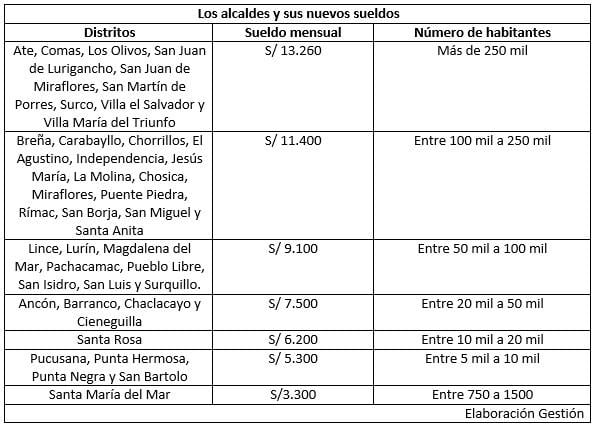 Los alcaldes de nueve distritos, entre ellos, San Juan de Lurigancho y Surco, ganarán S/13,260 mensuales, mientras que las autoridades de otras 14 jurisdicciones, entre ellas, Carabayllo y Miraflores, recibirán un sueldo de S/11, 400.