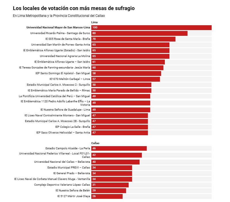 La Universidad Nacional Mayor de San Marcos (UNMSM) contará con 100 mesas de sufragio y será el local que recibirá al mayor número de votantes este domingo 12 de abril, seguido de la Universidad Ricardo Palma (80), la IE 005 Rosa de Santa María (70) y la Universidad San Martín de Porres, sede Santa Anita (65), según una nota de Andina.
