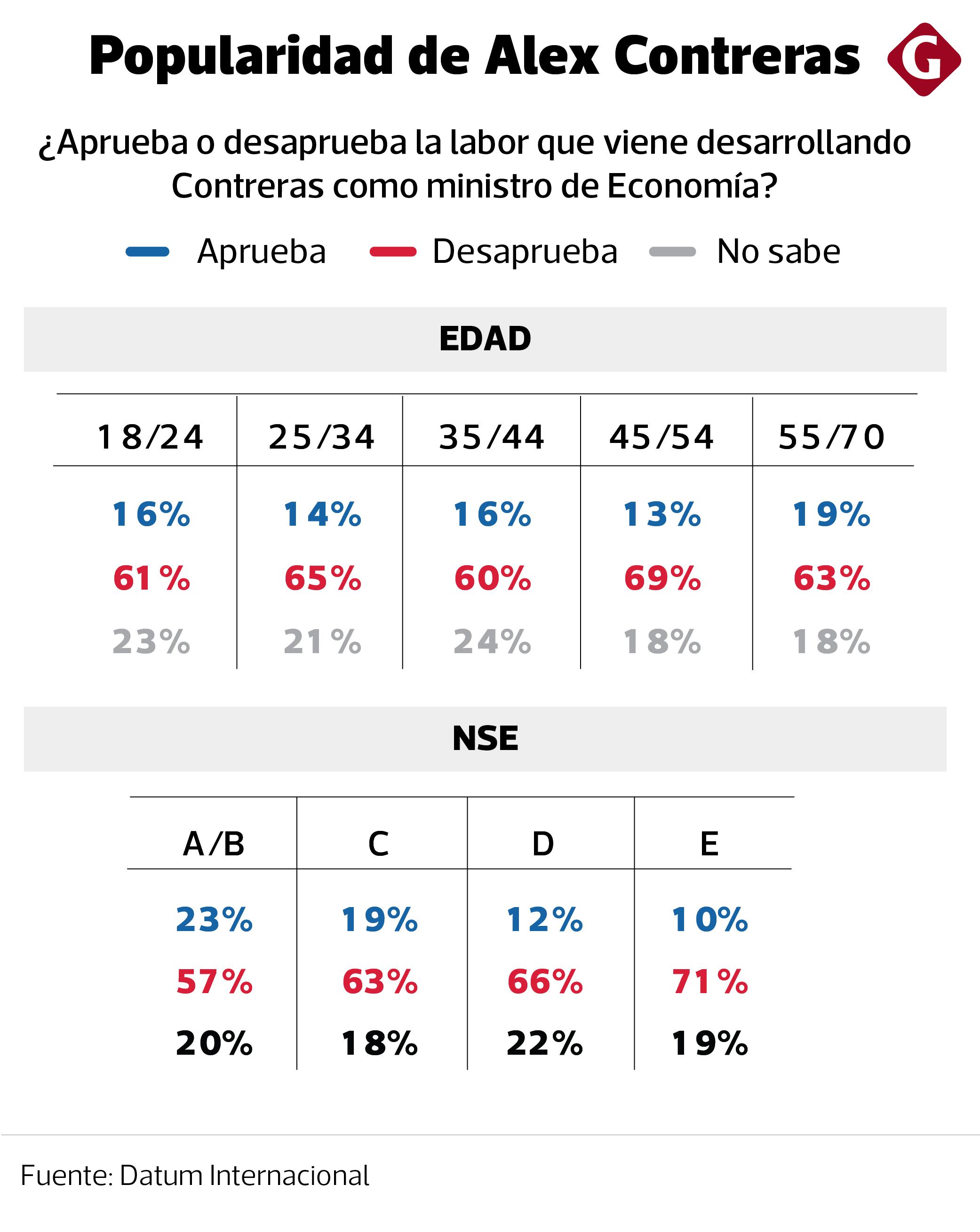 En el caso del ministro de Economía, Alex Contreras, su aprobación disminuyó de 18% a 15%, mientras que su desaprobación se incrementó de 59% a 64%.