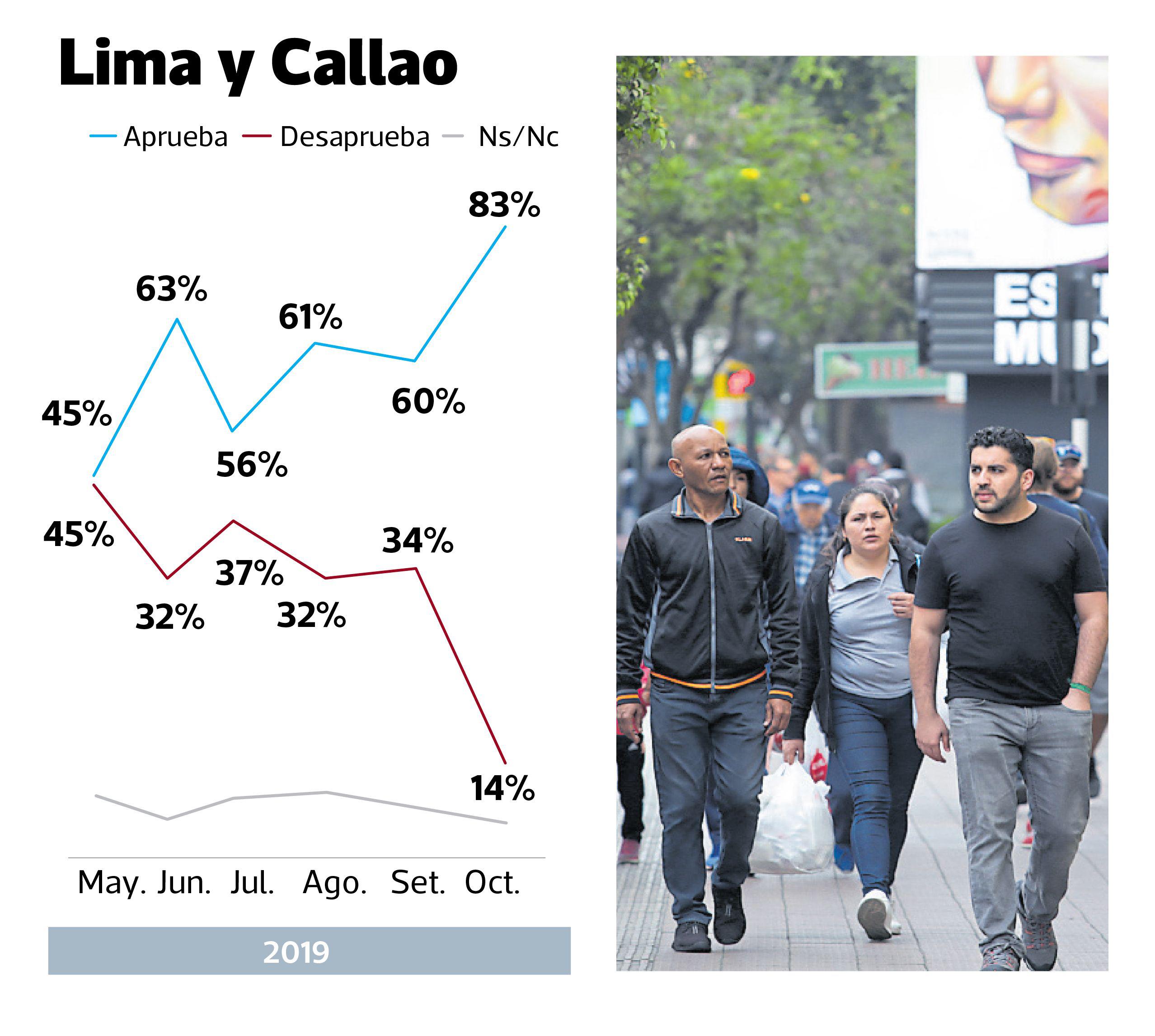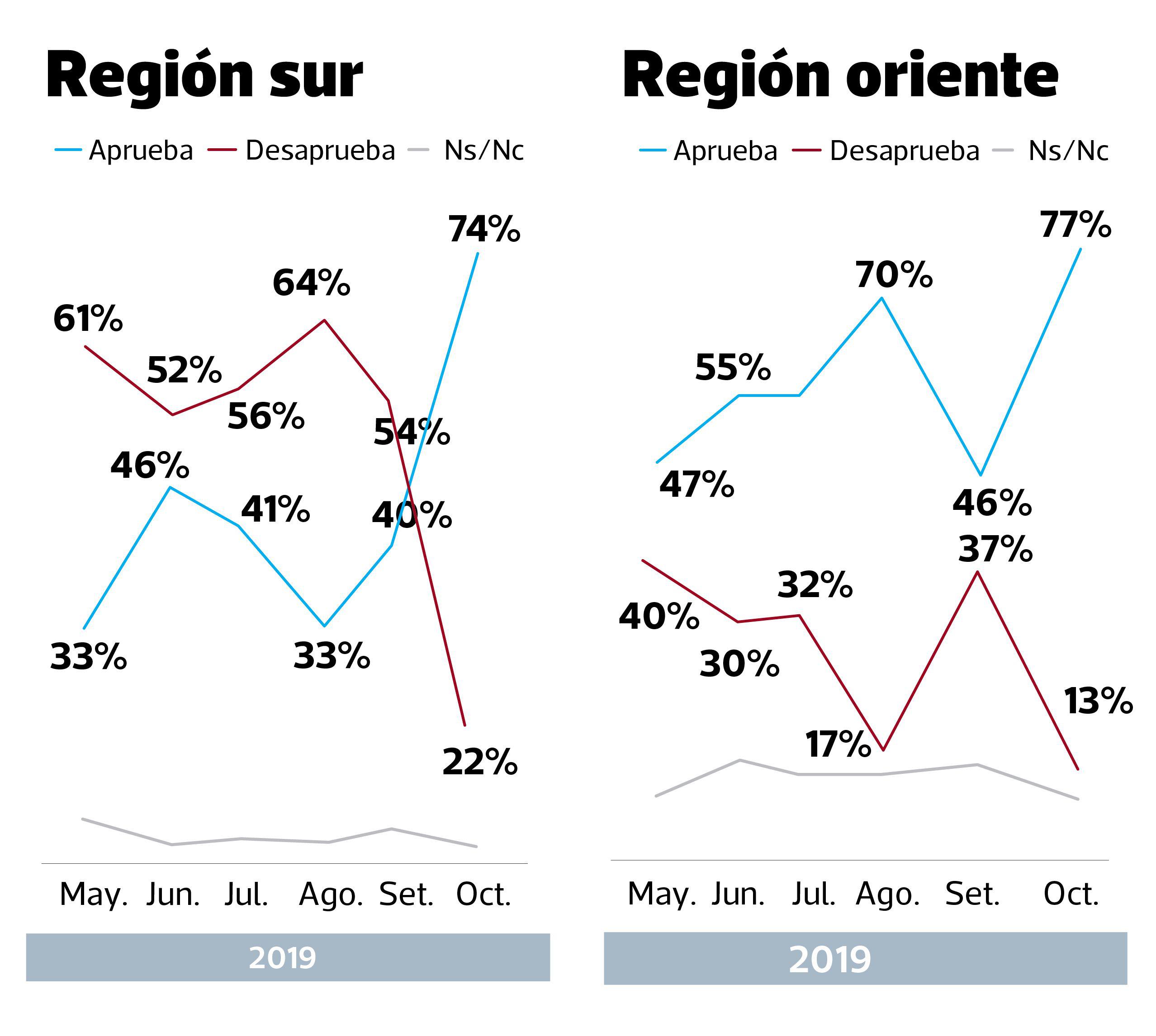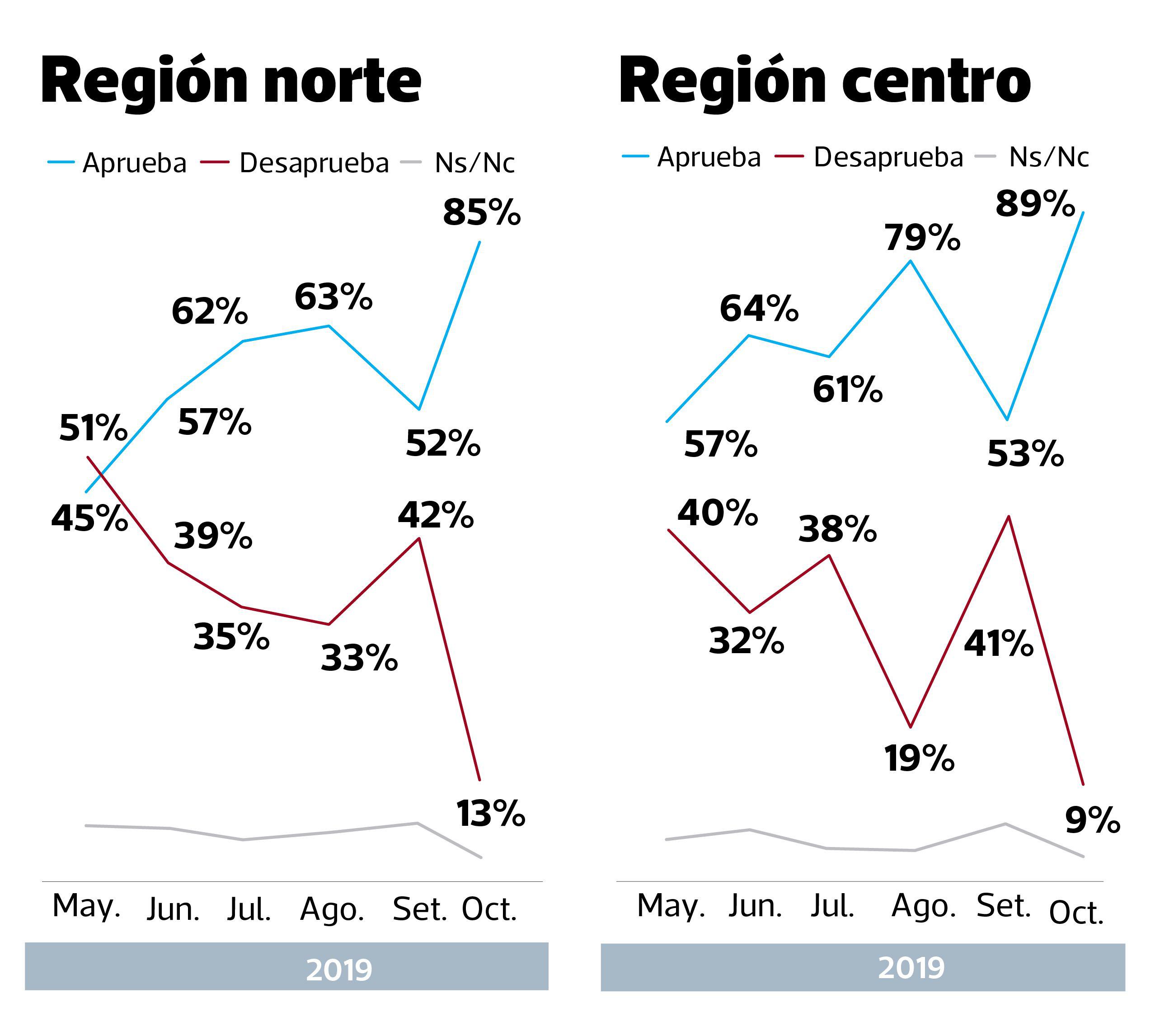 En el caso de las regiones, la que más apoya al presidente es el centro, con 89%. Hace un mes la aprobación llegaba a 53%. Le sigue Lima, con 85%, 23 puntos más que en setiembre.