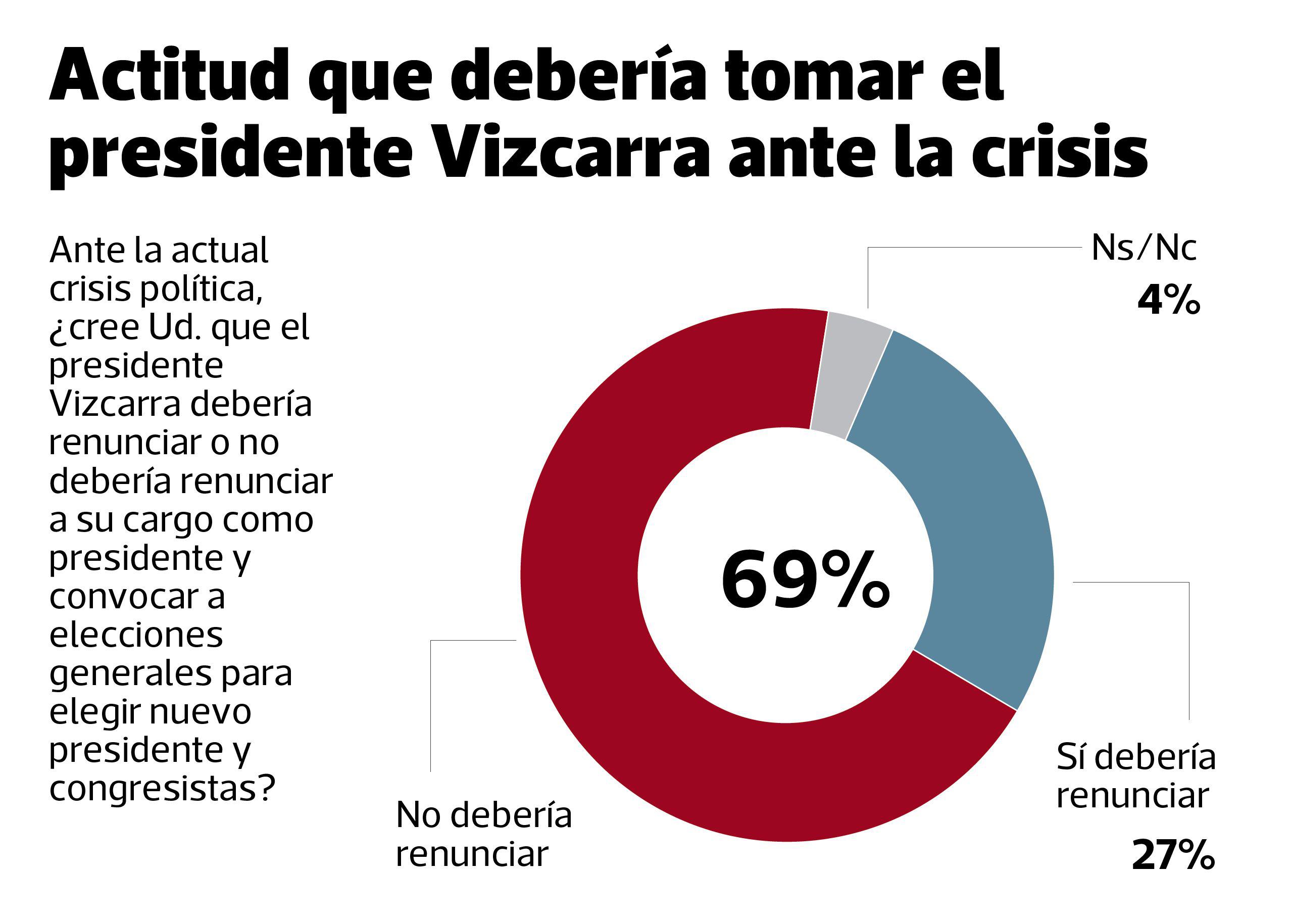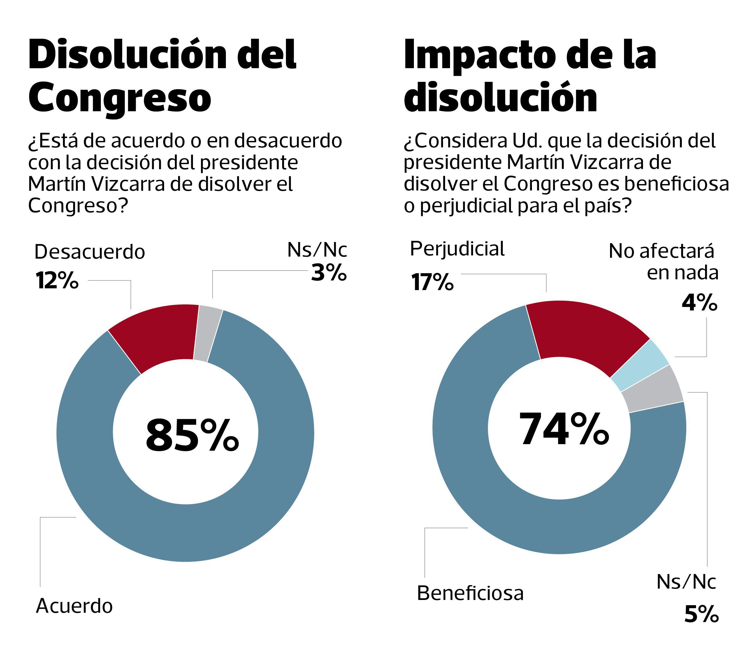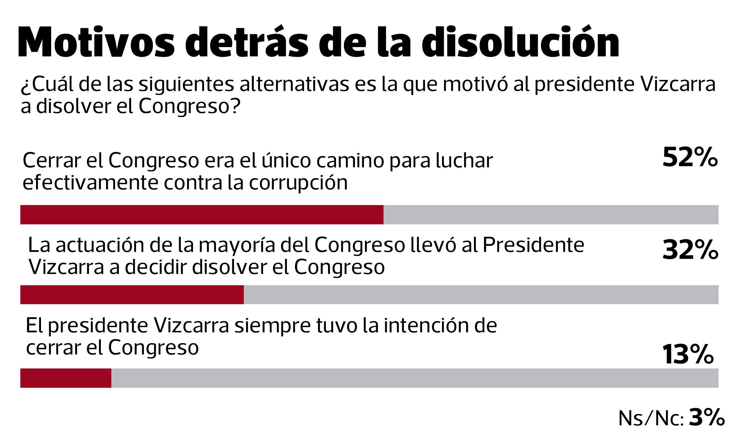 Luego de la disolución del Congreso, el presidente Vizcarra registra un crecimiento en la popularidad sin precedentes (pasa de 52% a 82% en un mes). Si comparamos con 1992, la aprobación de Fujimori creció 11 puntos (de 63% a 74%, con un pico posterior de 81% en setiembre). Esta aceptación inicial principalmente se sustenta en la mala imagen del Parlamento, pues 59% de la población cree que los congresistas son los responsables de la crisis política. La mayoría de peruanos no solo está de acuerdo (85%) con la medida, sino que además consideran que está de acuerdo a la Constitución (77%). Asimismo, tres de cada cuatro peruanos creen que la decisión del presidente será beneficiosa para el país y que este no debe renunciar al cargo (69%). En lo que no hay consenso, es si la convocatoria a elecciones debe ser solo para elegir congresistas o elecciones generales que incluyan la elección de un nuevo presidente, pues aunque los encuestados no ven en Vizcarra la intención de quedarse después del 2021, existe el deseo ciudadano de un nuevo inicio que contribuya a la reactivación y crecimiento del Perú.