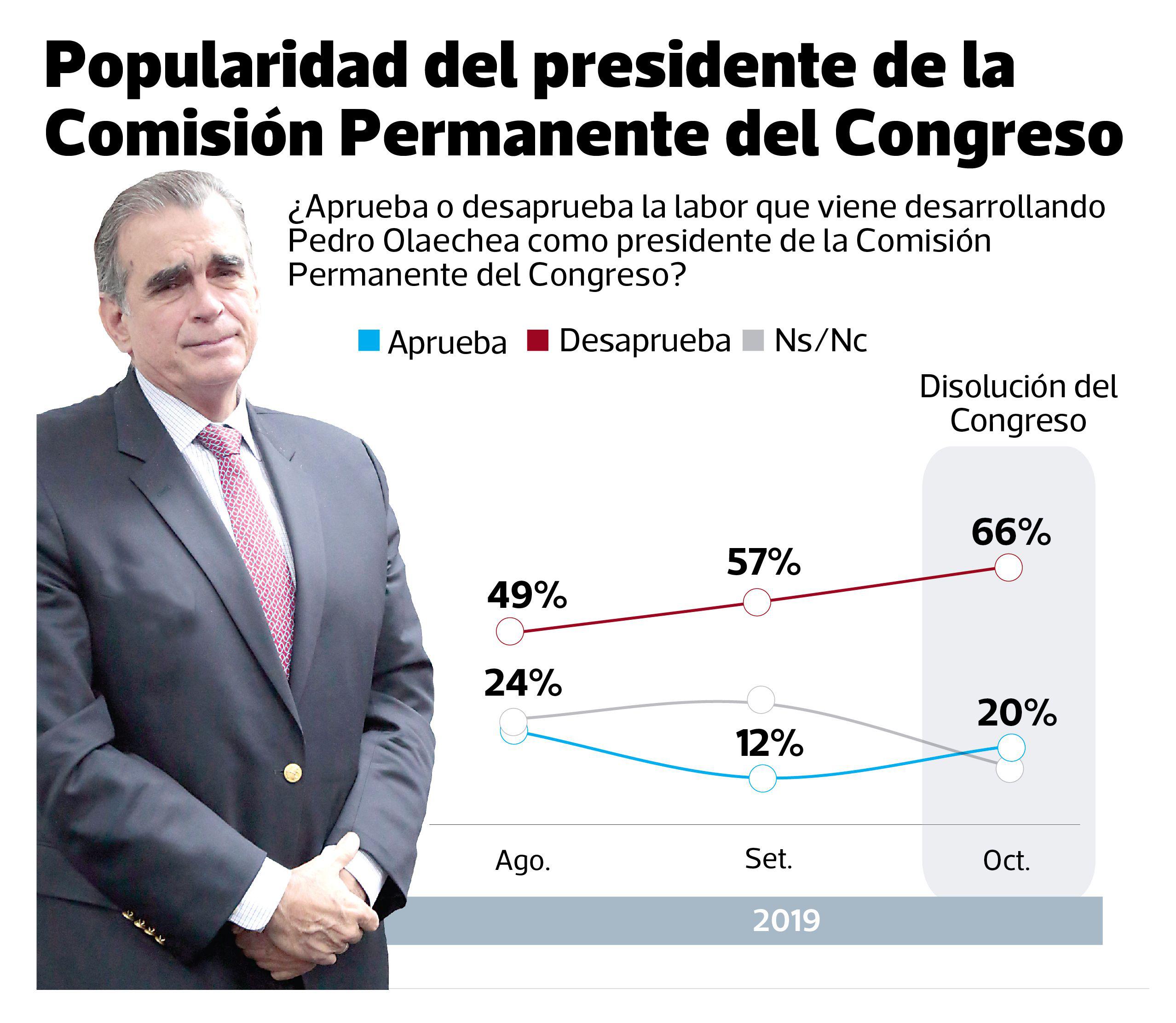 La aprobación de Pedro Olaechea llega a 20%. Se trata de ocho puntos porcentuales más que el mes pasado. El respaldo al titular de la Comisión Permanente llega incluso a 25.3% en el sector E y a 27.5% en el centro del país.