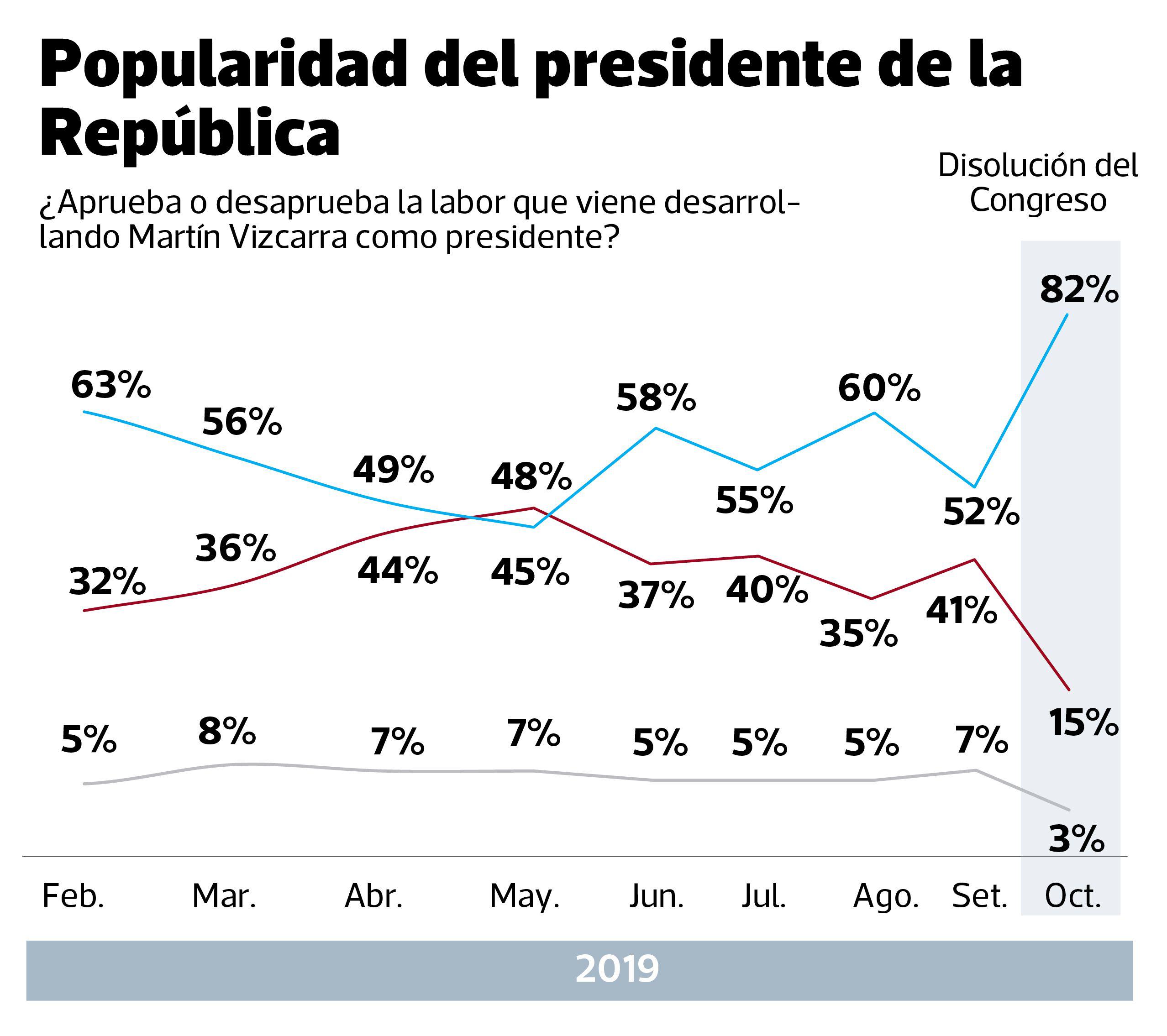 Sobre la popularidad de Vizcarra, esta alcanzó el 82%. Se trata, largamente, del mayor respaldo alcanzado por el jefe de Estado desde que llegó a la Casa de Pizarro.
