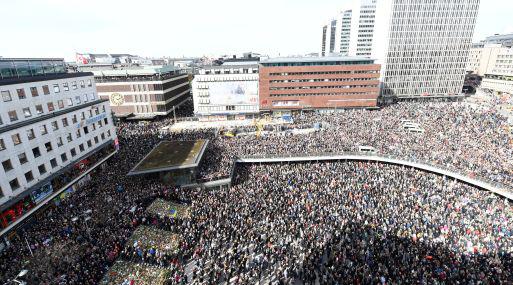 El sol acompañó a los manifestantes, que alzaban sus manos con el signo de la paz, al ritmo de la música. Rikard Wolff, un actor y cantante muy popular en el país, cantó "El himno al amor" de Édith Piaf, en versión sueca.