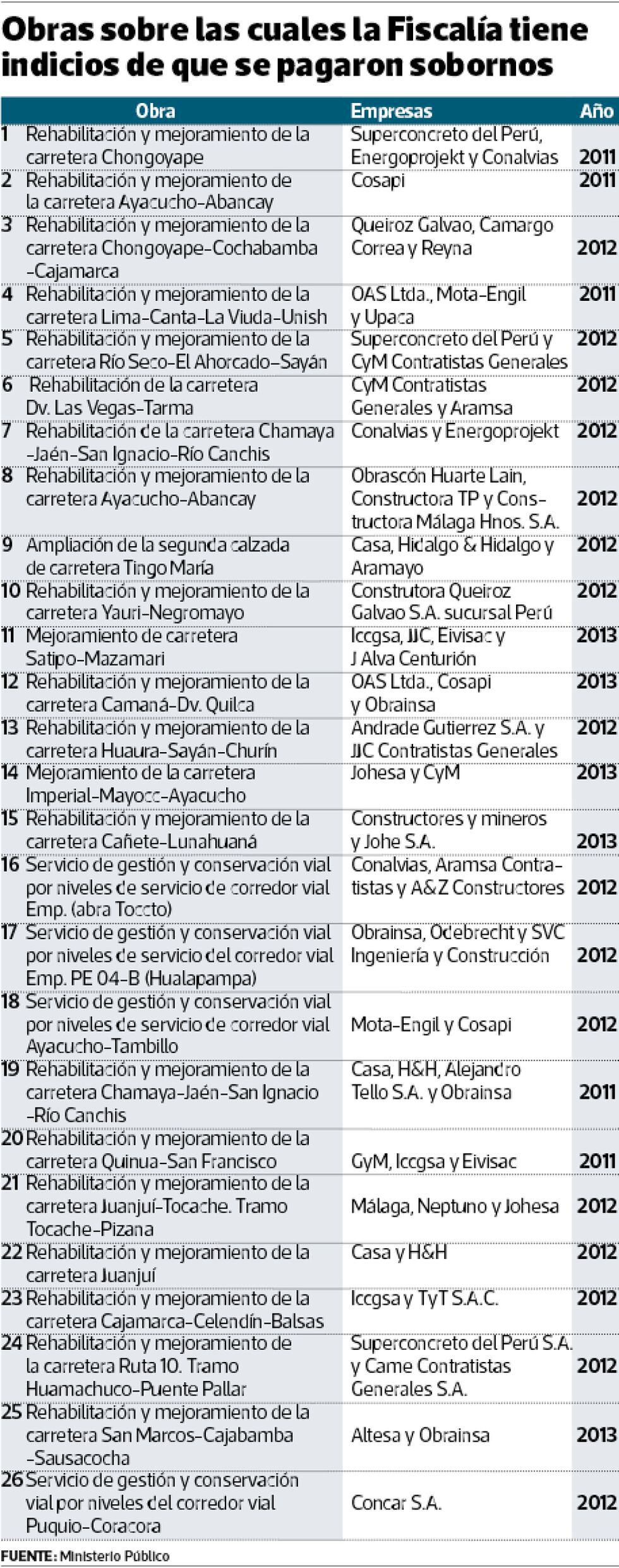 A la indagación ahora se añadieron ocho nuevas obras en las cuales el fiscal sostiene que el cártel de constructoras también habría operado, mediante el pago de presuntas coimas (ver tabla).
