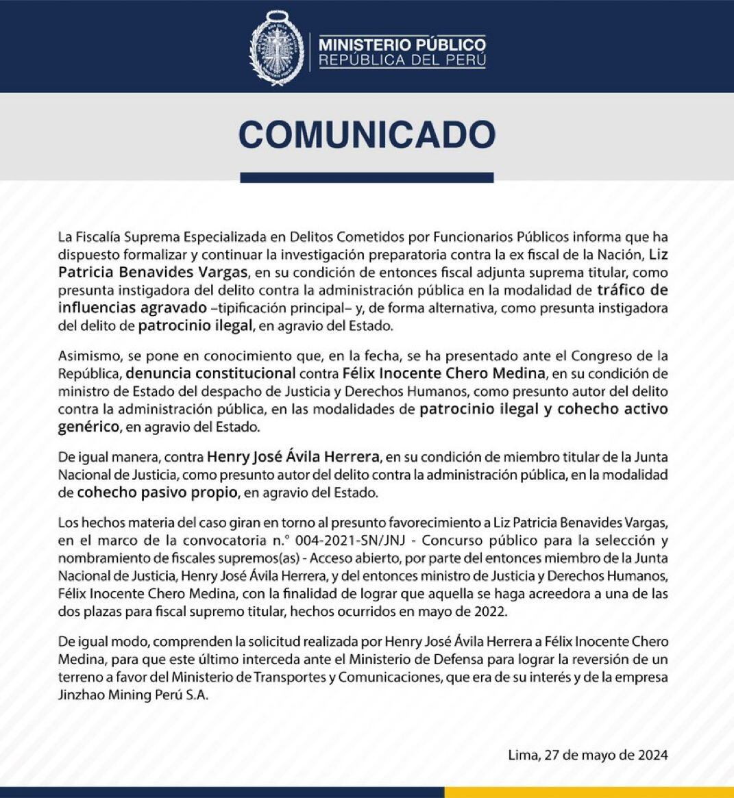 LEA TAMBIÉN: Fiscalía presentó denuncia constitucional contra Patricia Benavides