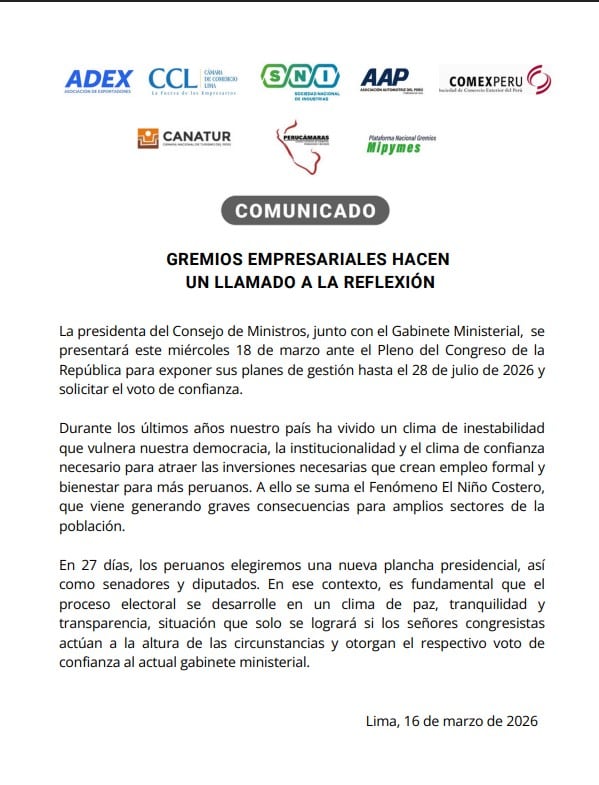 A 48 horas de que la presidenta del Consejo de Ministros, junto con el Gabinete Ministerial, se presente ante el Pleno del Congreso de la República para exponer sus planes de gestión hasta el 28 de julio de 2026 y solicitar el voto de confianza, distintos gremios empresariales hicieron una llamado a los congresistas.