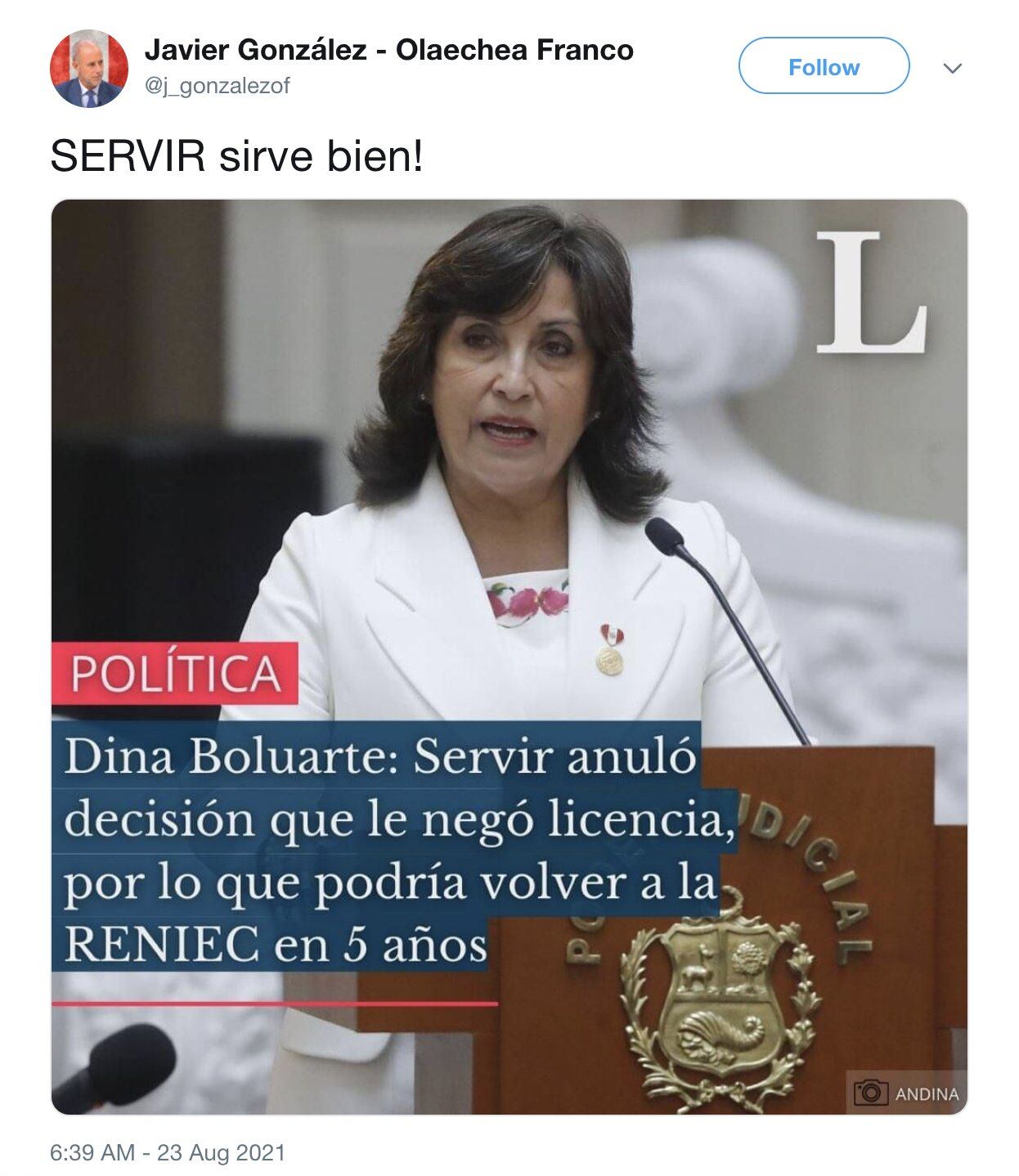 González-Olaechea también emitió furibundas críticas contra Boluarte, tanto en las redes sociales como en columnas de opinión.