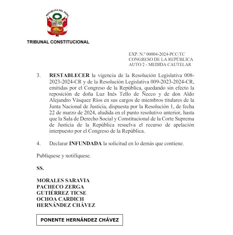 El magistrado del Tribunal Constitucional (TC), César Ochoa, informó esta noche que el colegiado resolvió declarar fundada la medida cautelar interpuesta por el Congreso para que quede sin efecto la restitución de Aldo Vásquez e Inés Tello en la Junta Nacional de Justicia, hasta que la Sala de Derecho Constitucional y Social de la Corte Suprema de Justicia resuelva el recurso de apelación del Congreso.