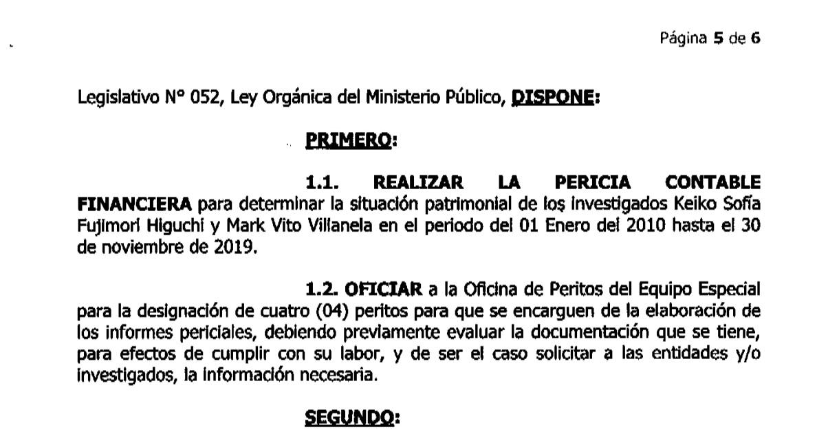 El fiscal José Domingo Pérez, del Equipo Especial Lava Jato, ordenó una pericia contable al patrimonio de Keiko Fujimori y Mark Vito Vilanella desde el 1 de enero de 2010 al 30 de noviembre de este año.
