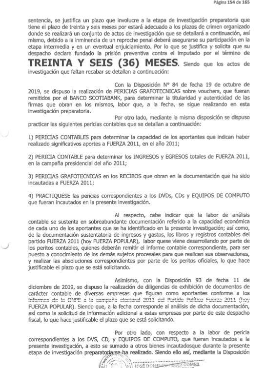 Al justificar el plazo de 36 meses para la prisión preventiva solicitada, Pérez indica que esta cantidad de tiempo se adecúa a los plazos de crimen organizado en los que se realizará un conjunto de actos de investigación, como la continuación de pericias grafotécnicas a vouchers bancarios, pericias contables para determinar los ingresos y egresos de Fuerza 2011 y para determinar la capacidad financiera de los aportantes que indican haber hecho aportes significativos a dicho partido.