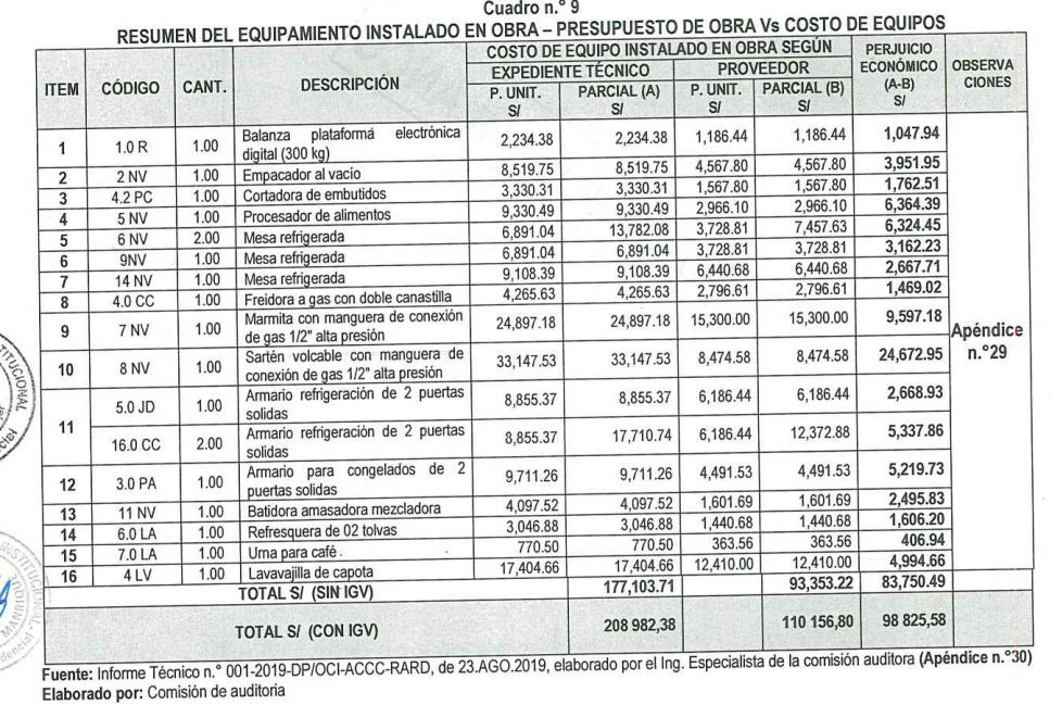 “Este equipamiento y mobiliario instalado no cumple con las características requeridas, afectando la finalidad de la contratación, al permitir la instalación de bienes distintos a los requeridos y de menor costo y que no se cuenta con la documentación técnica completa, ocasionando un potencial perjuicio económico a la Entidad por S/ 98,825.58”, señala el documento.