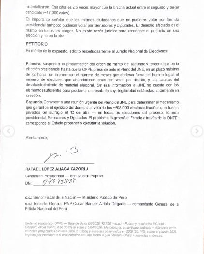 El líder de Renovación Popular, Rafael López Aliaga, solicitó al Jurado Nacional de Elecciones (JNE) suspender la proclamación del orden de mérito entre el segundo y tercer lugar en los comicios presidenciales, tras denunciar que graves fallas operativas de la ONPE impidieron que más de 600 mil ciudadanos en Lima Metropolitana ejercieran su derecho al voto, según calculos del candidato presidencial.