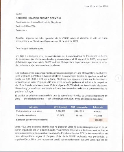 El propio JNE —señala la carta— reconoció parcialmente el problema al autorizar la reapertura de 13 centros de votación el 13 de abril para aproximadamente 51 mil electores afectados. No obstante, López Aliaga sostiene que esta cifra representa solo una fracción del total real de ciudadanos perjudicados.