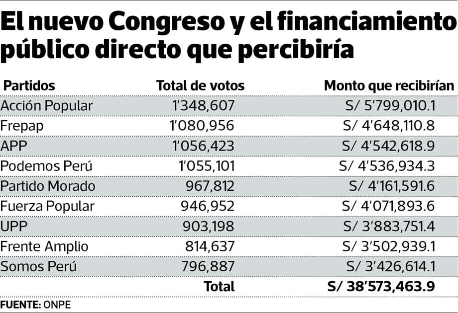 Finalmente, el Apra, Contigo, Restauración Nacional, PPC y Vamos Perú, al no conseguir escaño en este nuevo Parlamento, perdieron este estipendio por parte del Estado.