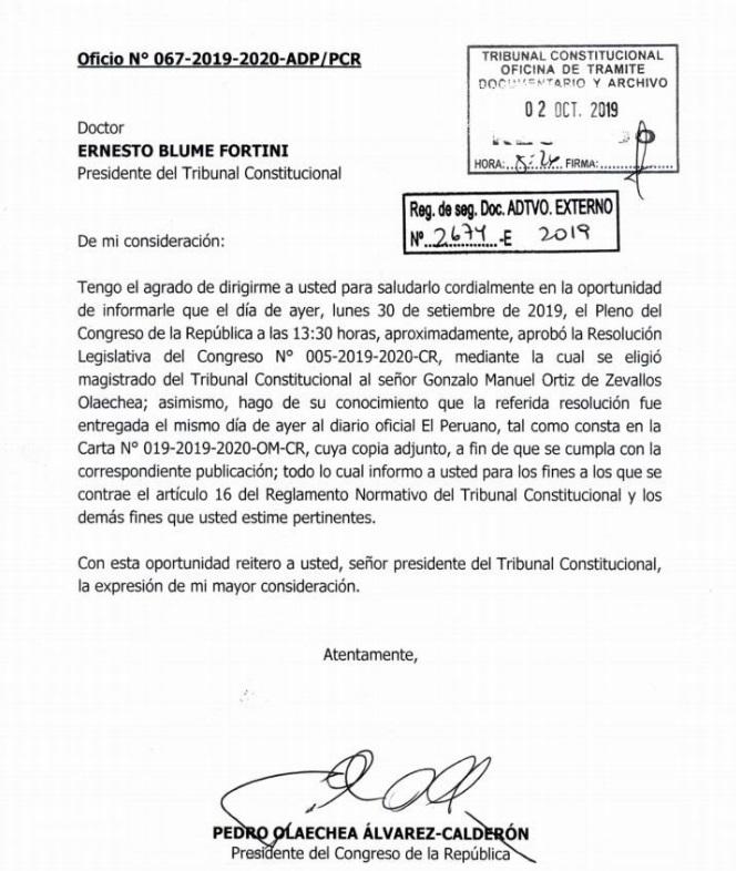 “La información oficial se entrega al titular del TC para los fines que se indica en el artículo 16 del Reglamento Normativo del Tribunal Constitucional, que señala que los miembros del TC asumen sus cargos dentro de los diez días siguientes a la publicación en el diario oficial El Peruano de la correspondiente Resolución Legislativa que los nombra”, señaló Olaechea.